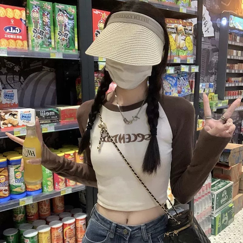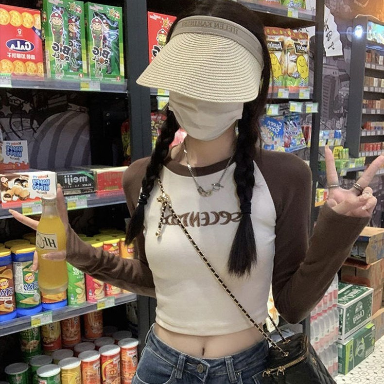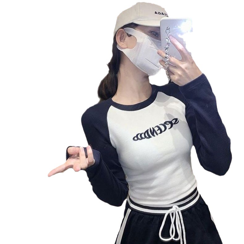 纯棉美式复古长袖t恤女早秋设计感小众修身显瘦甜辣撞色短款上衣