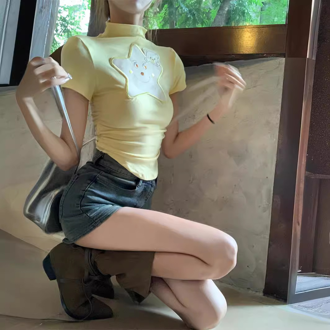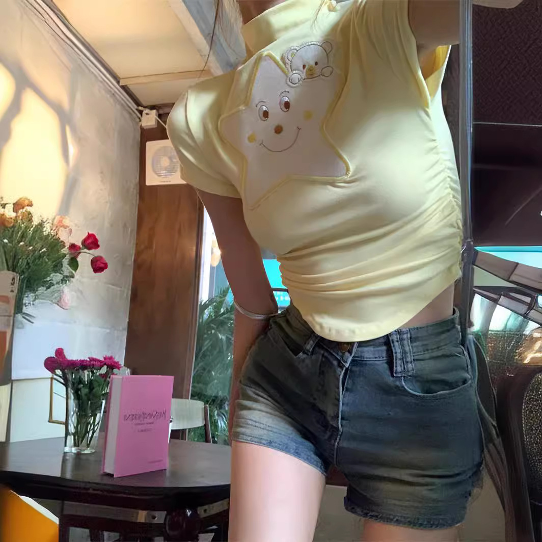 纯棉多巴胺穿搭女装短款t恤女短袖辣妹纯欲小个子修身正肩上衣潮