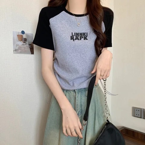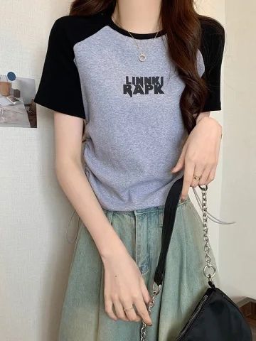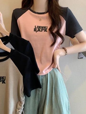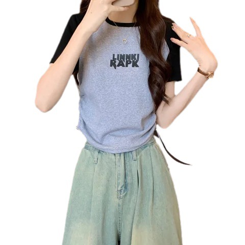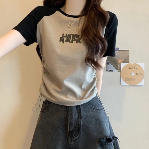 美式插肩短袖t恤女夏季修身显瘦正肩设计感小众抽绳辣妹短款上衣