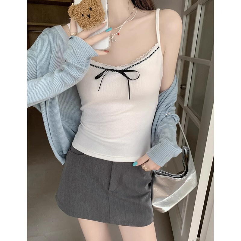 韩版纯色露肩无袖上衣短款修身蝴蝶结蕾丝花边辣妹夏季吊带女