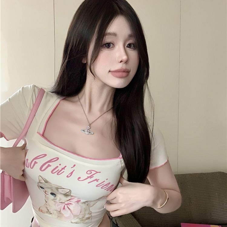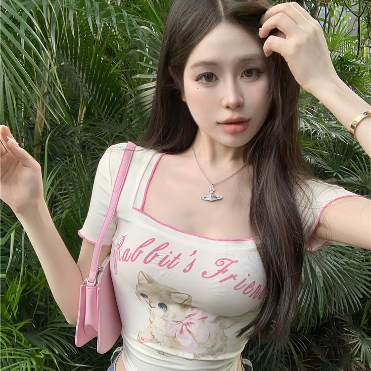 夏装纯欲风辣妹港味正肩露胸方领设计感小众短袖T恤女夏短款上衣