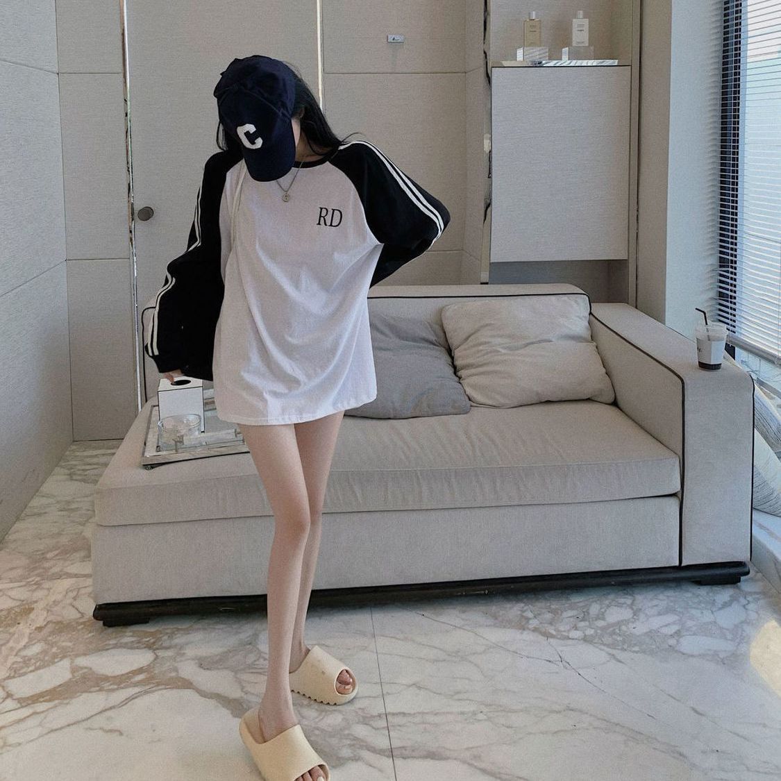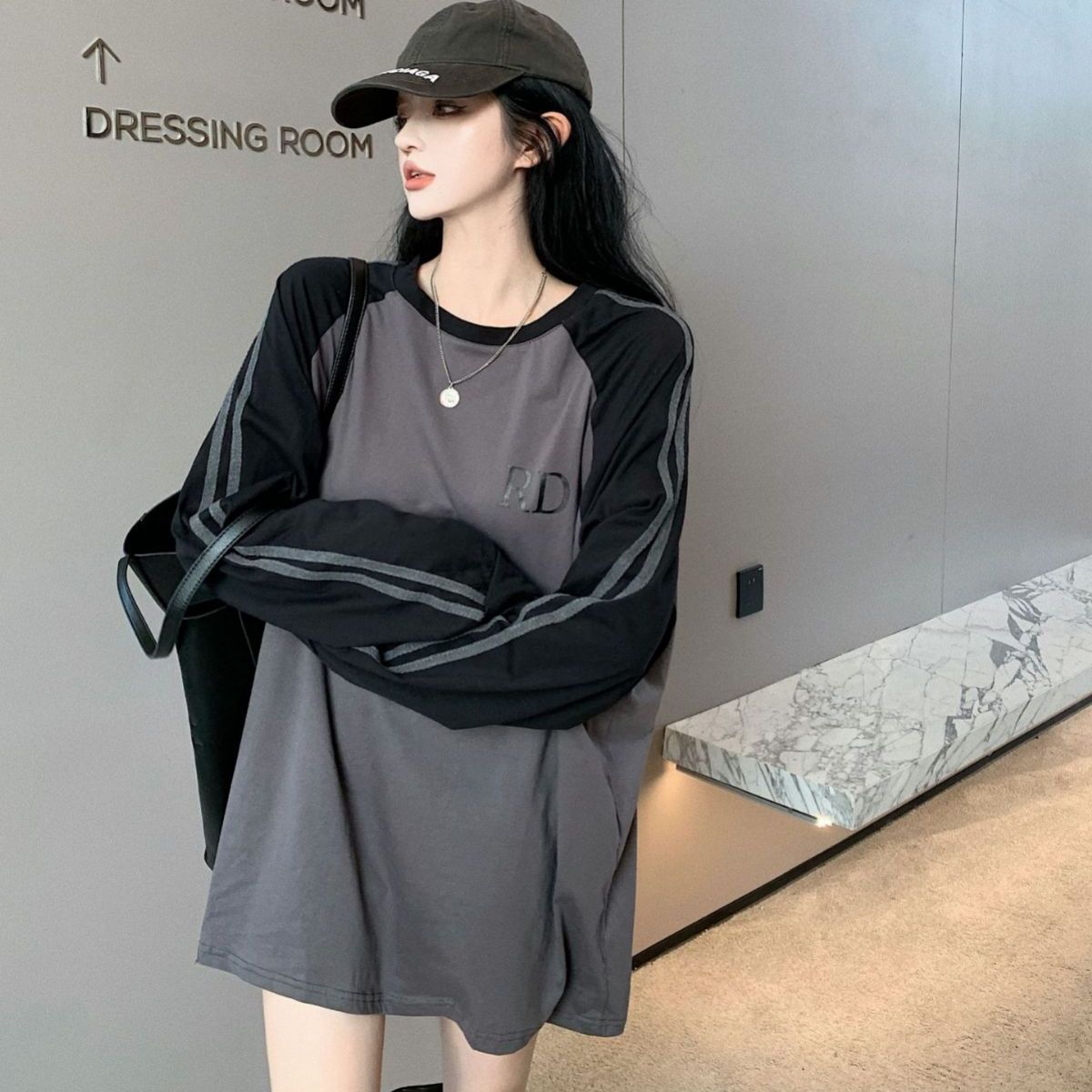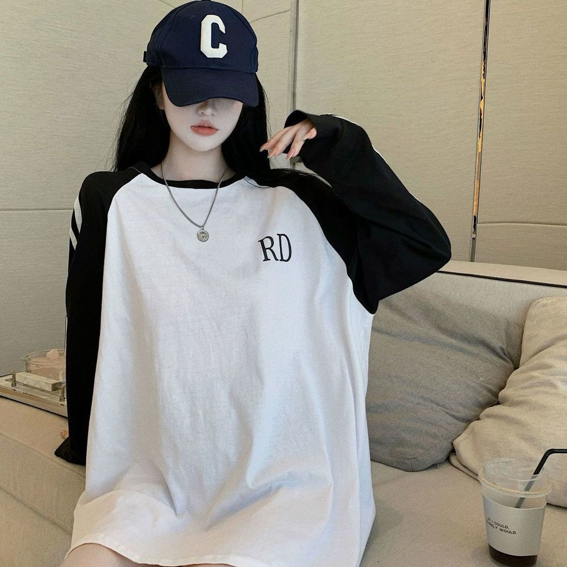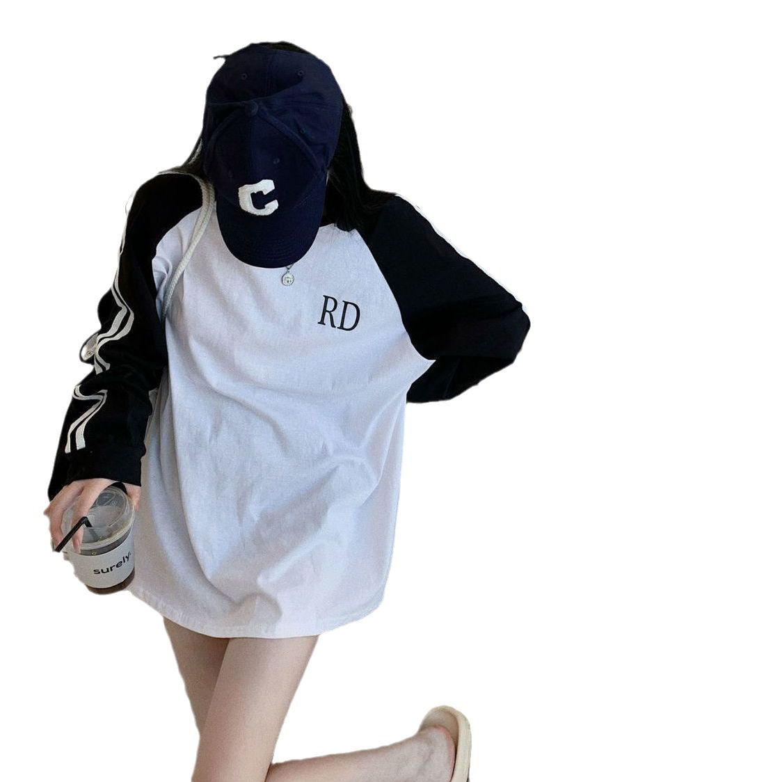纯棉韩系复古插肩拼色长袖T恤女宽松美式圆领春秋季薄款上衣