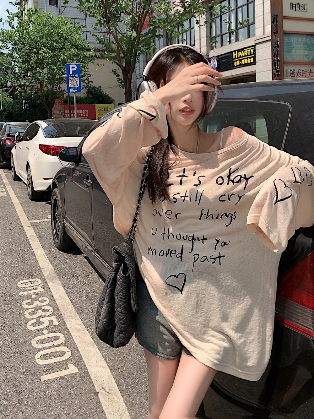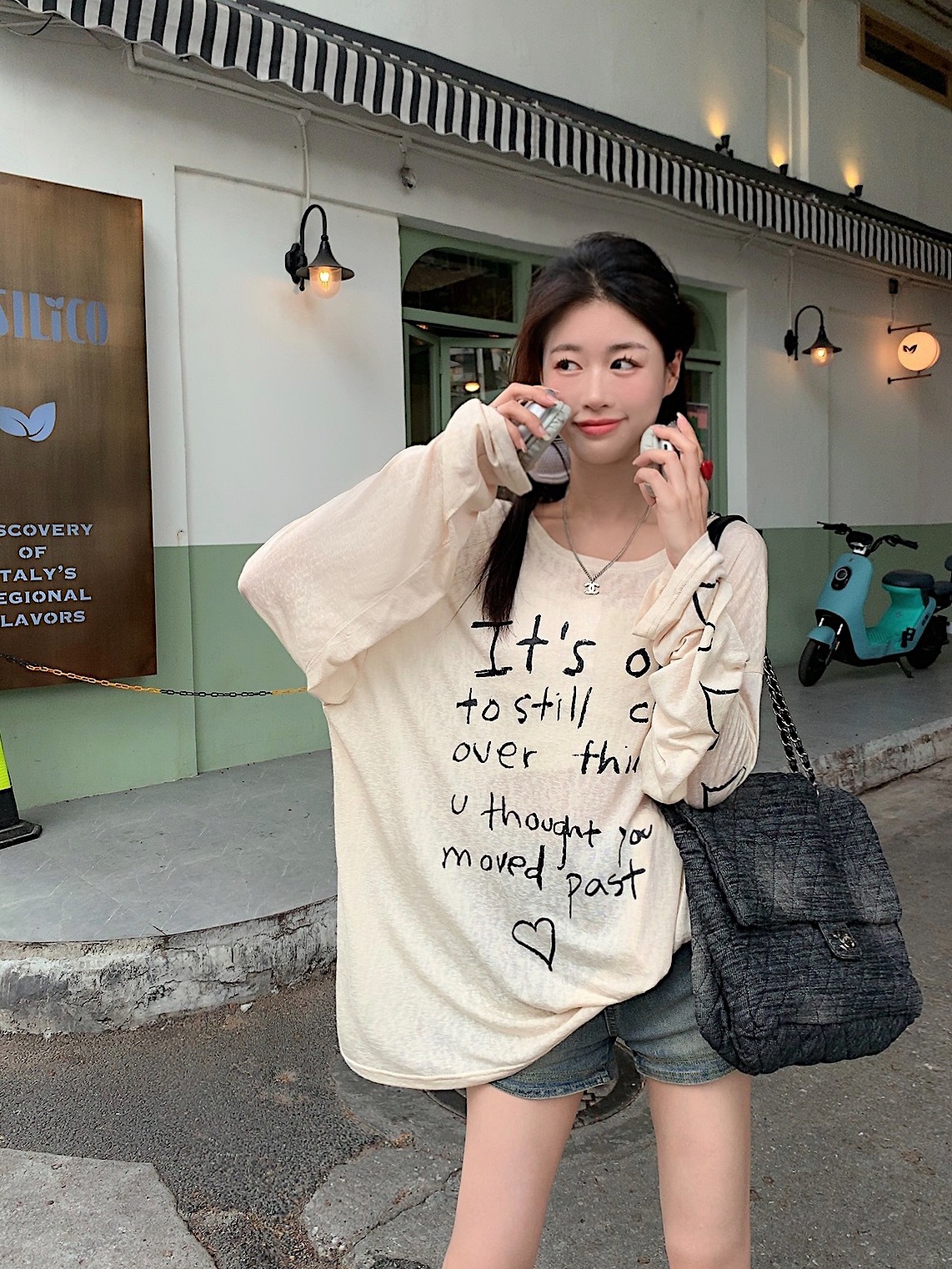 螺纹字母爱心印花防晒T恤女夏新款长袖薄款宽松显瘦度假空调罩衫