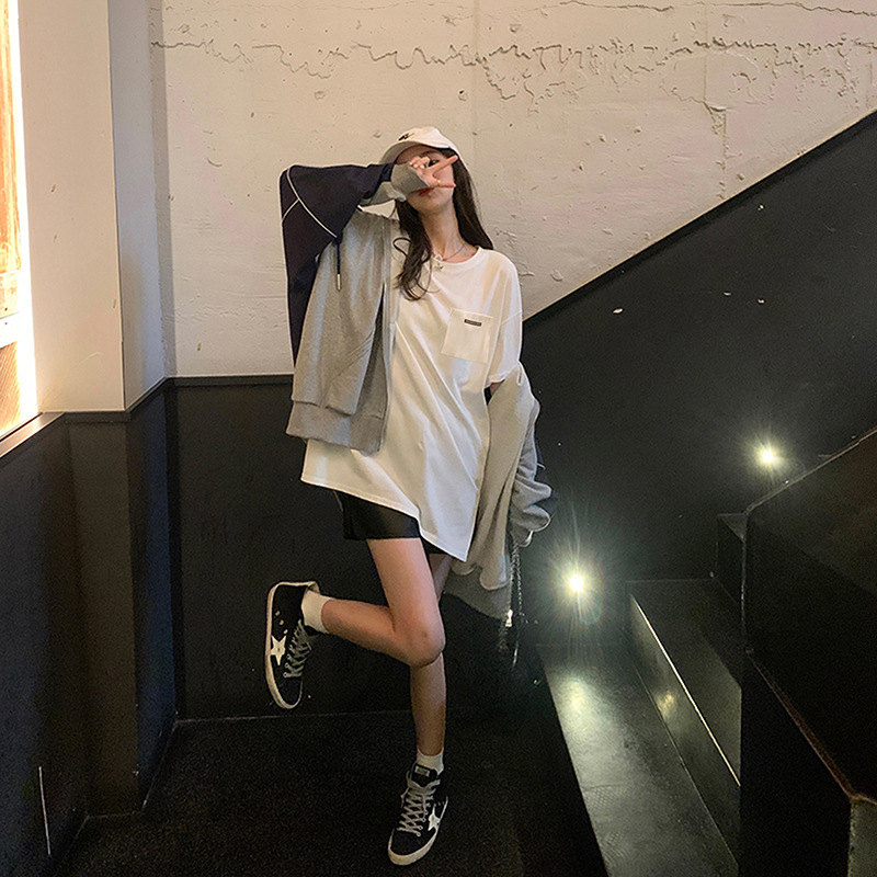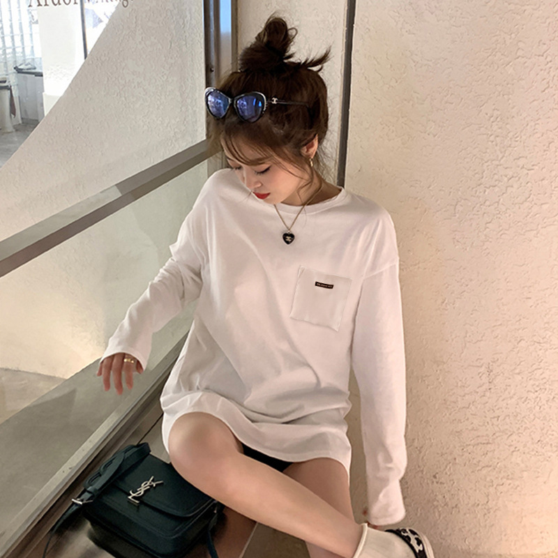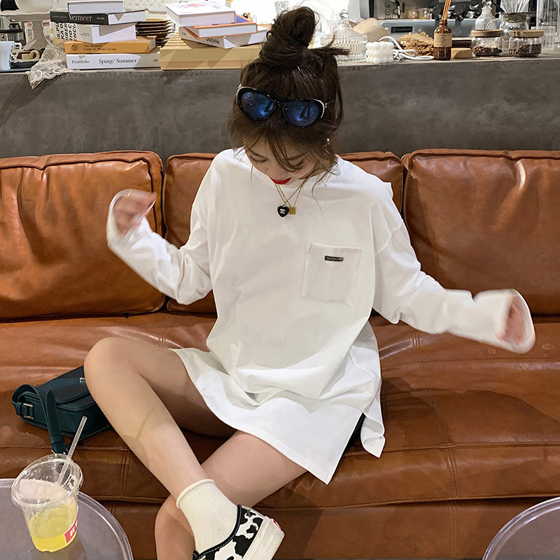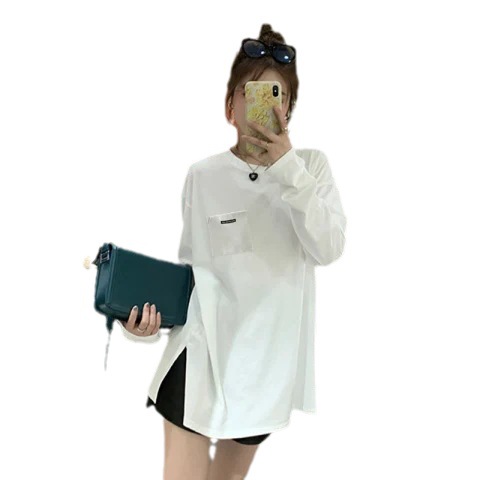 纯棉长袖T恤女春秋季2025年新款开叉慵懒风上衣宽松休闲打底衫