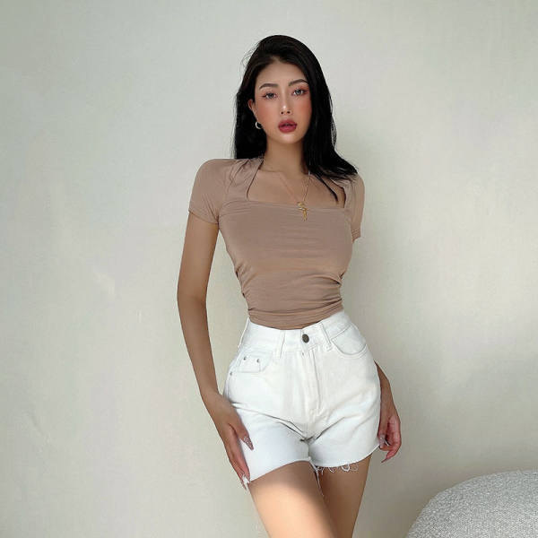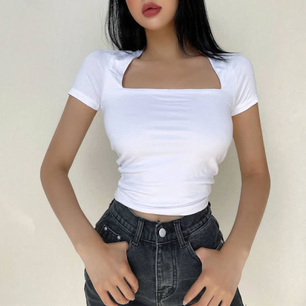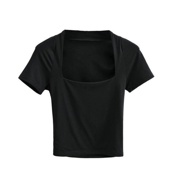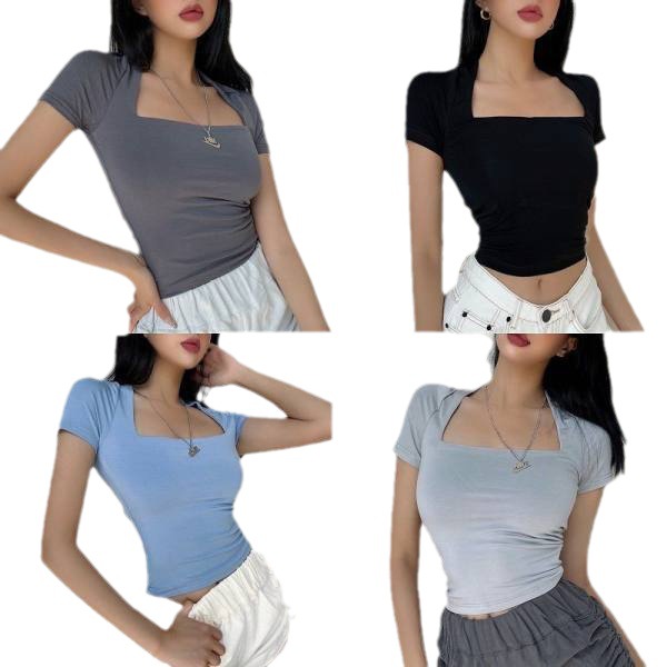 正肩短袖T恤女设计感小众夏季辣妹chic别致黑色修身方领短款上衣