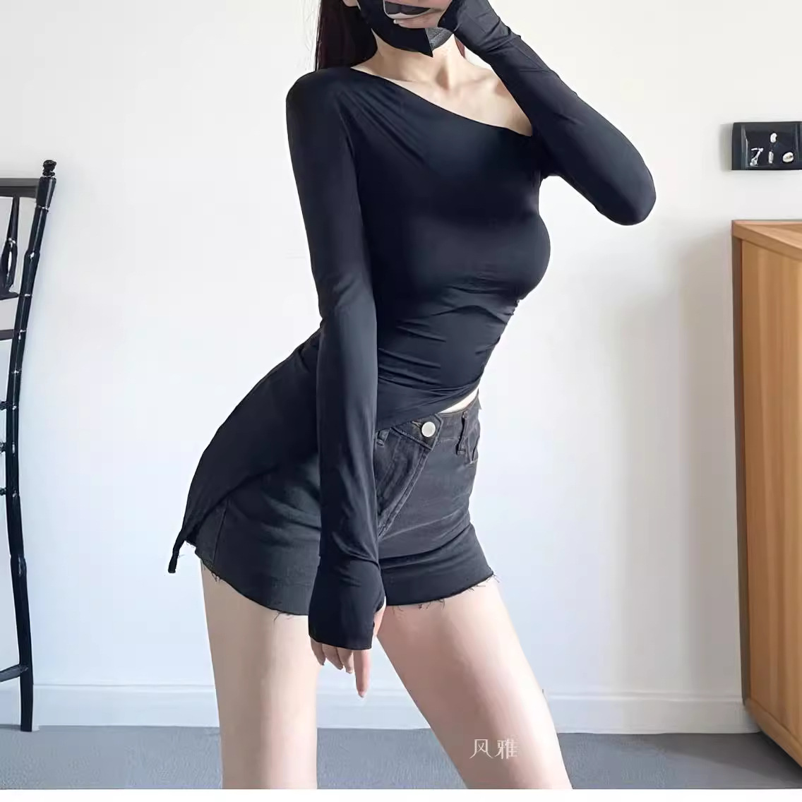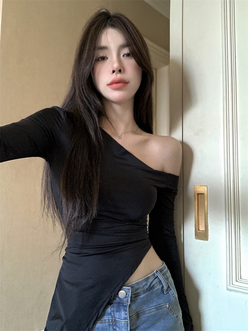 不规则斜肩辣妹上衣修身小众设计感长袖t恤女欧货洋气时髦