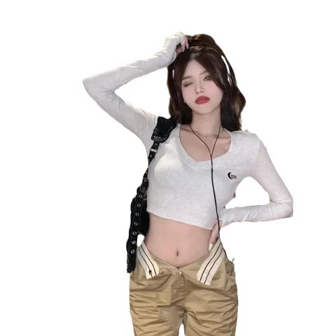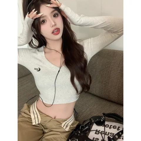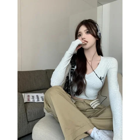美式复古V领长袖T恤女春秋辣妹紧身短款设计感小众内搭上衣打底衫