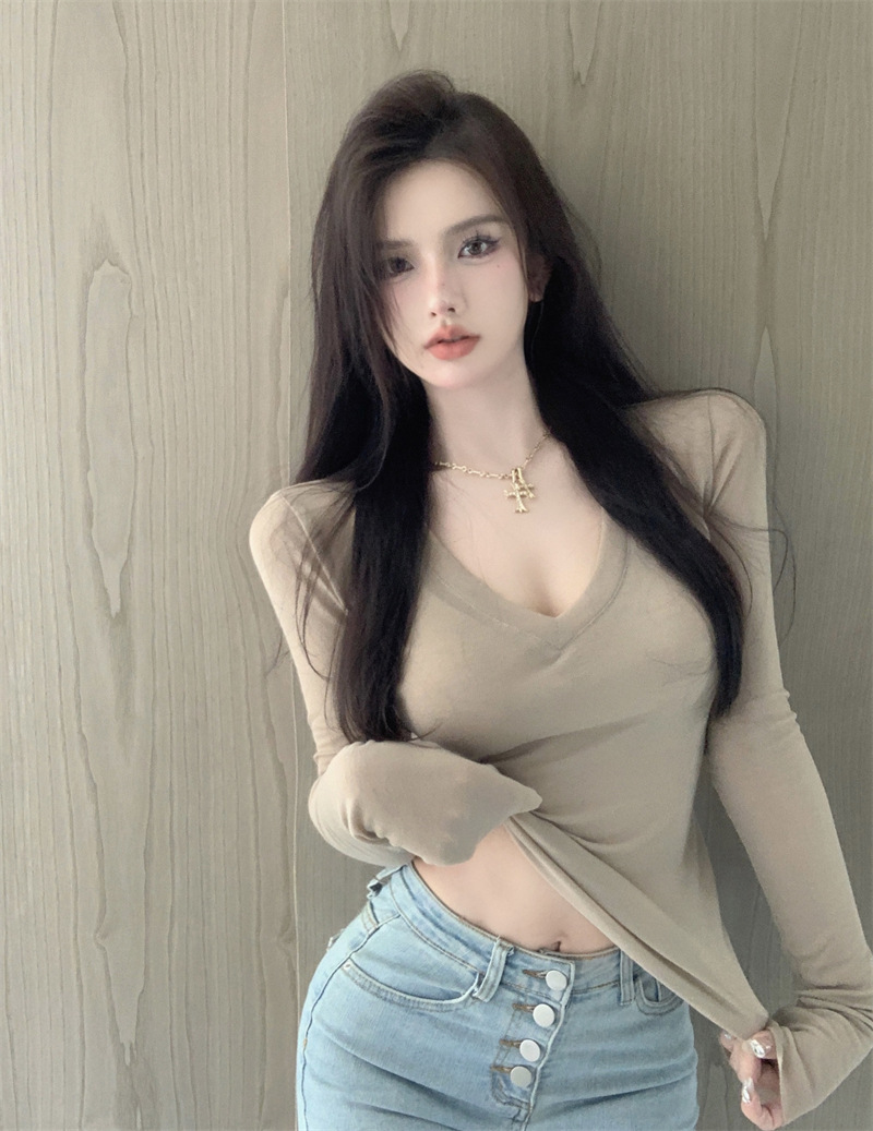 白色辣妹T恤女秋冬V领性感紧身内搭打底衫修身显瘦长袖短款上衣