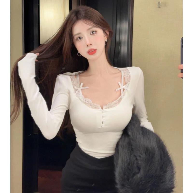 纯欲风辣妹性感蕾丝修身假两件长袖T恤内搭打底今年流行漂亮小衫