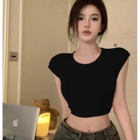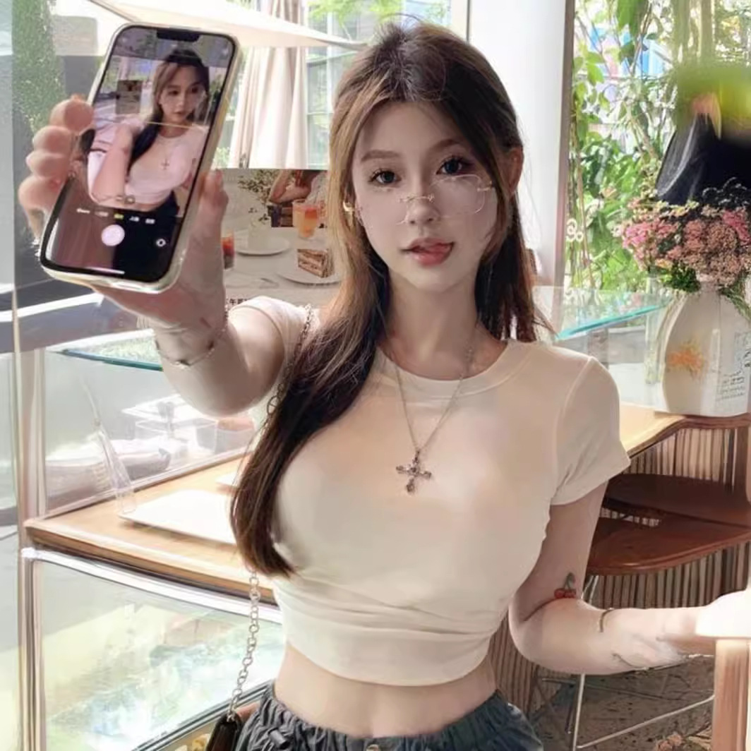 夏季新款韩版U领露锁骨纯欲辣妹修身短款学生短袖上衣女