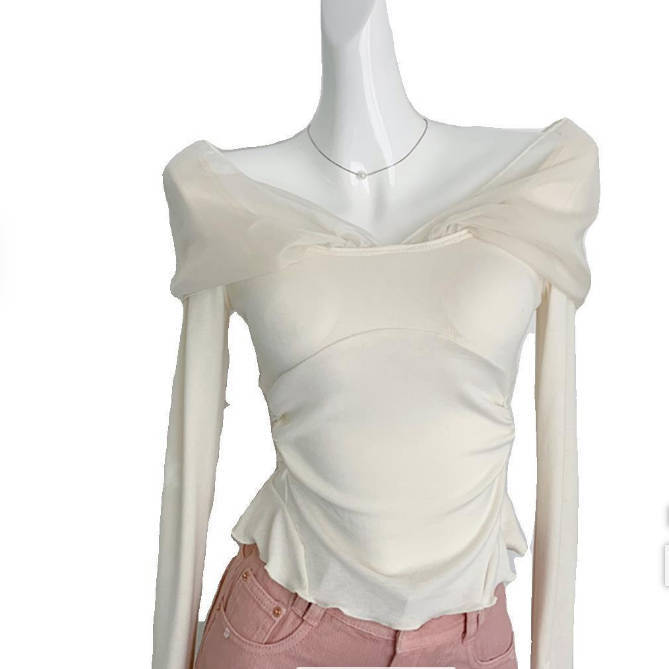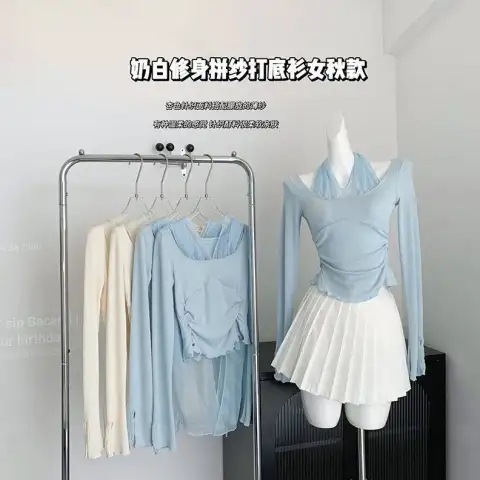 内外搭挂脖甜辣风上衣韩版简约修身拼纱打底衫法式长袖t恤女欧货