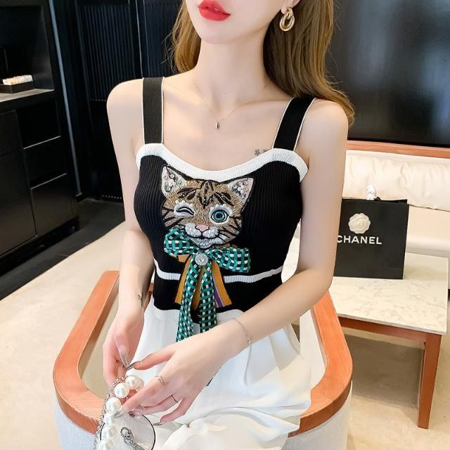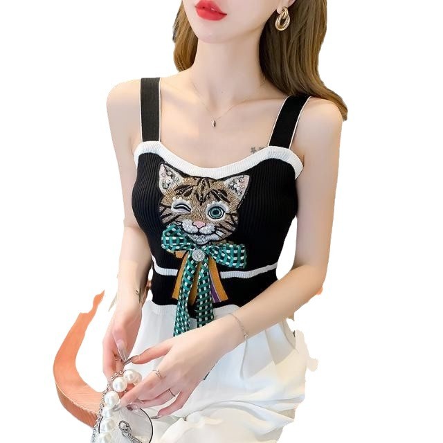 法式针织吊带背心女早秋外穿重工猫咪短款打底黑色抹胸性感吊带