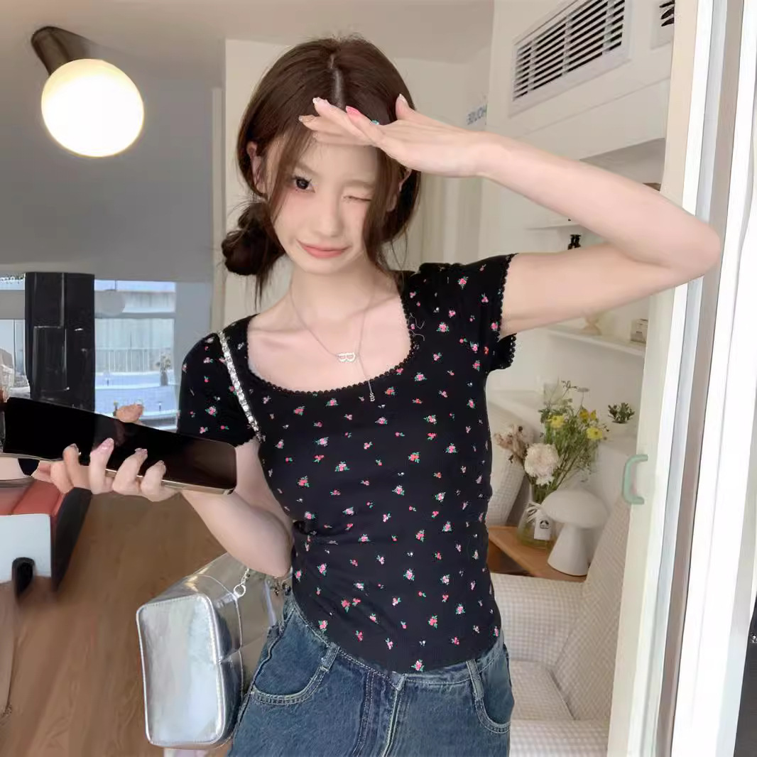 方领正肩短袖T恤女夏季新款韩版修身显瘦碎花甜美内搭短款上衣ins