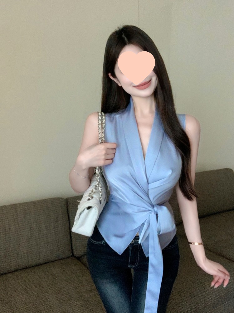 法式缎面绑带v领无袖衬衫女夏季收腰修身设计感衬衣时尚气质上衣