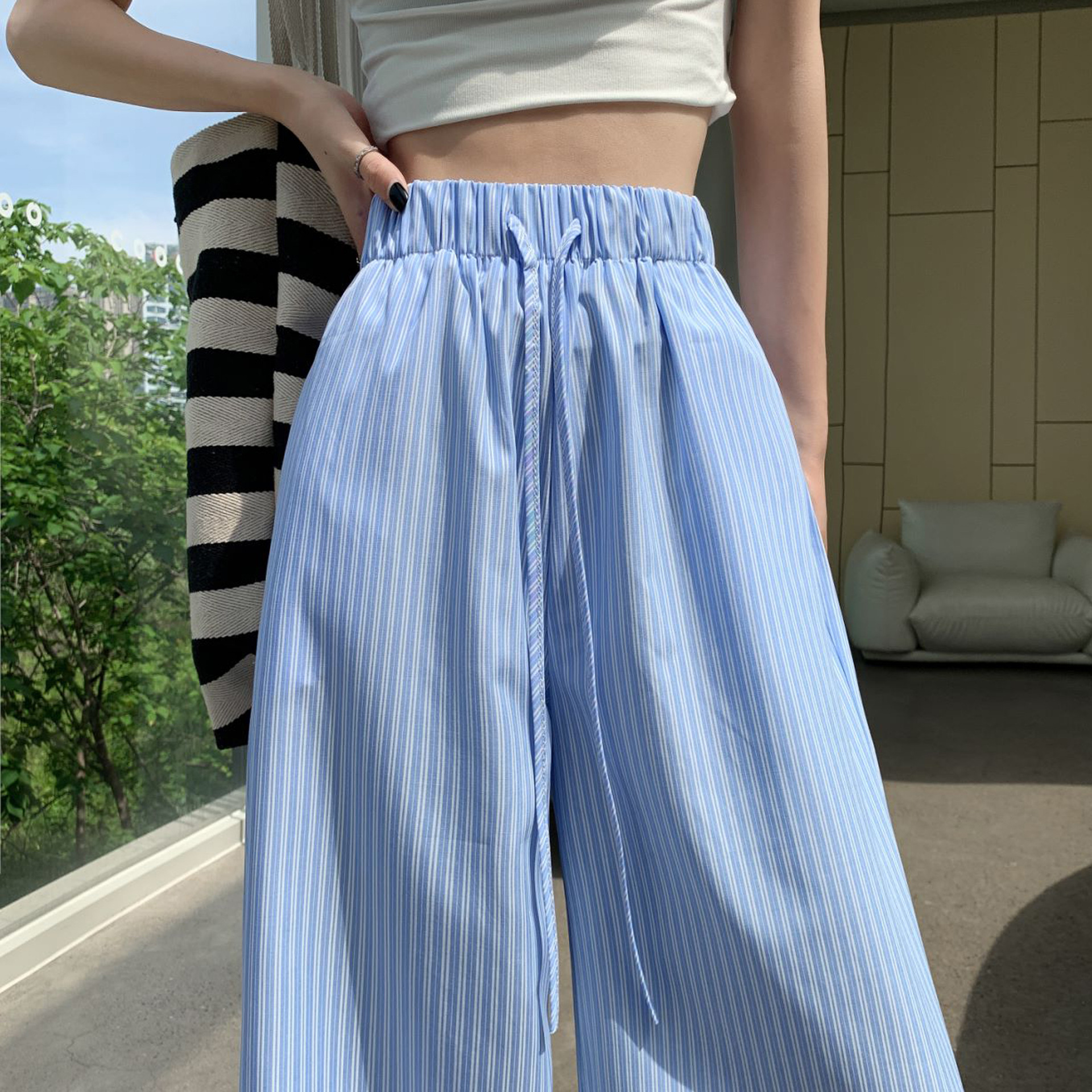 蓝色条纹冰丝阔腿裤女夏季薄款裤子小个子高腰宽松垂感休闲凉凉裤