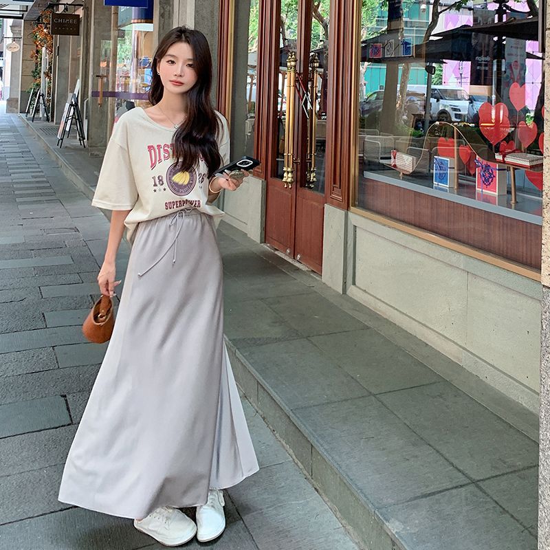 夏季穿搭一整套女新款法式休闲字母印花t恤及踝半身裙两件套