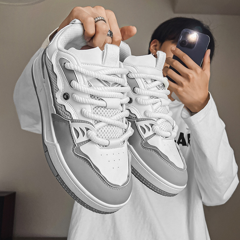 直播四季款皮面网布复古设计情侣日系板鞋增高休闲厚底小众男潮鞋