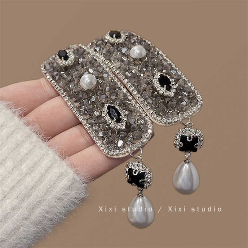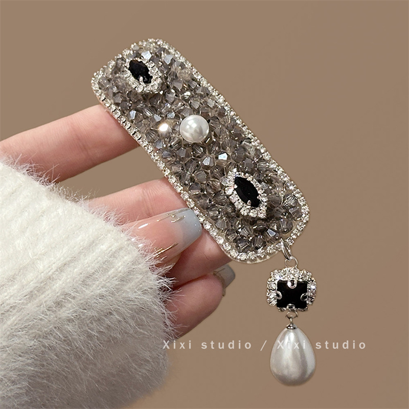 灰色水钻黑色宝石珍珠吊坠发夹