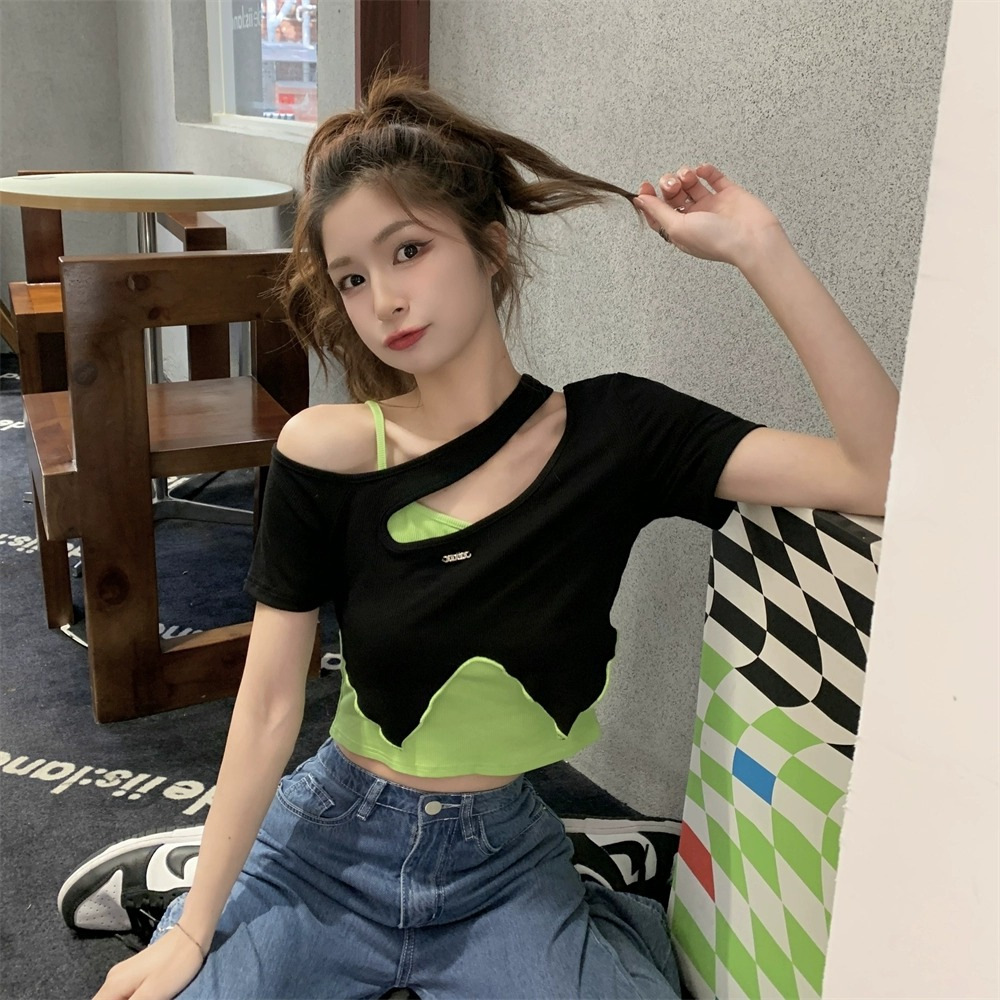 辣妹设计感T恤女夏季新款两件套撞色不规则露肩外穿短款短袖上衣