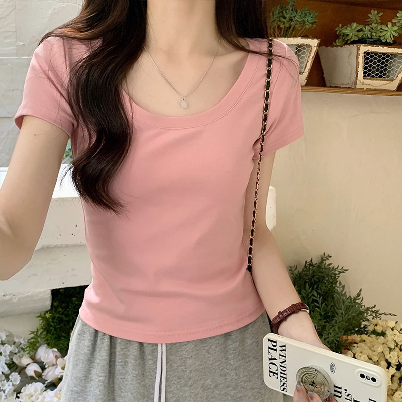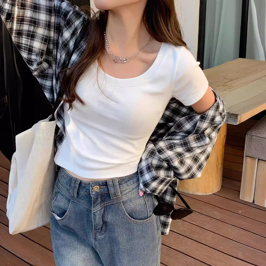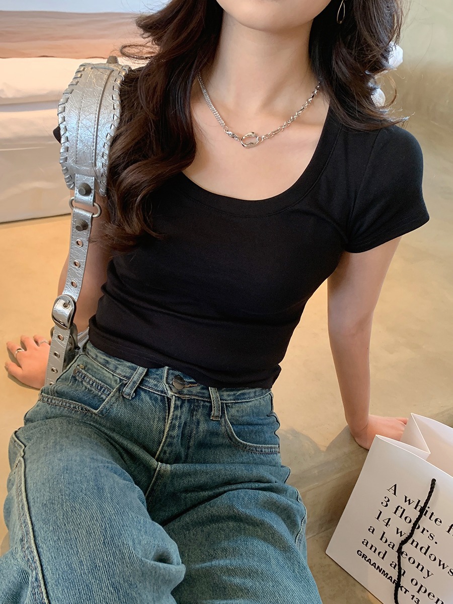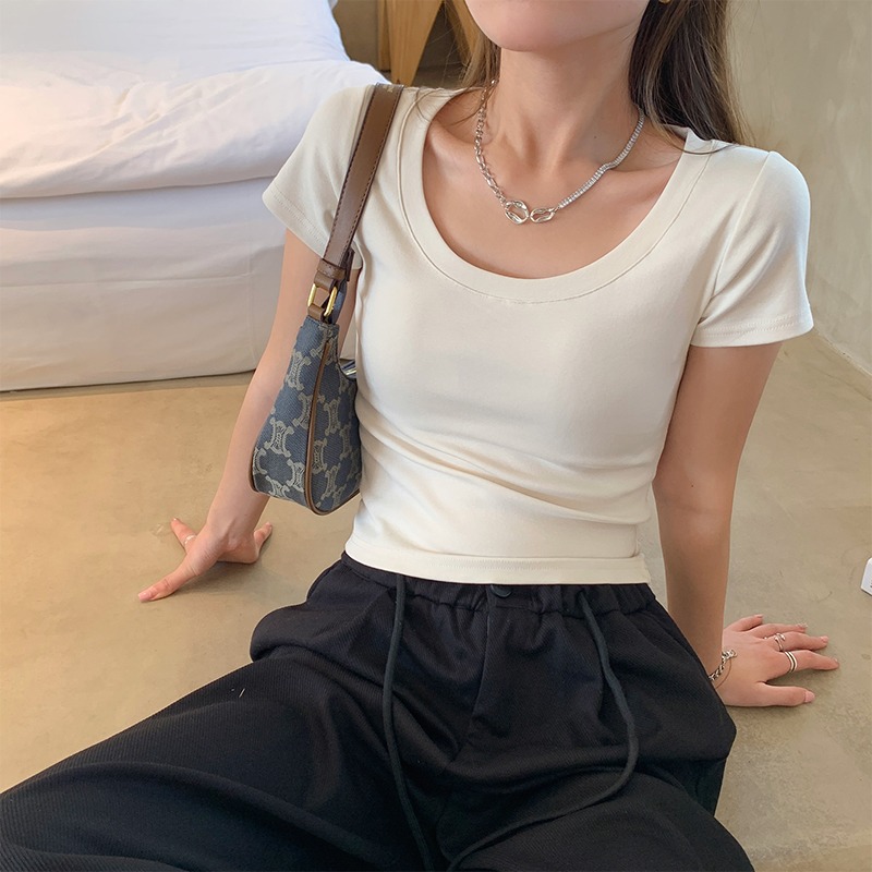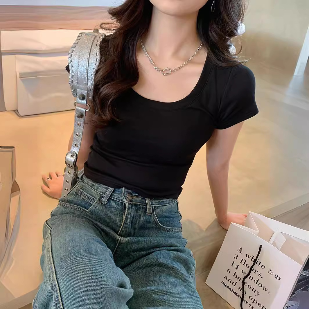 正肩短袖t恤女2025新款白内搭u领显瘦打底衫圆领修身短款白色上衣