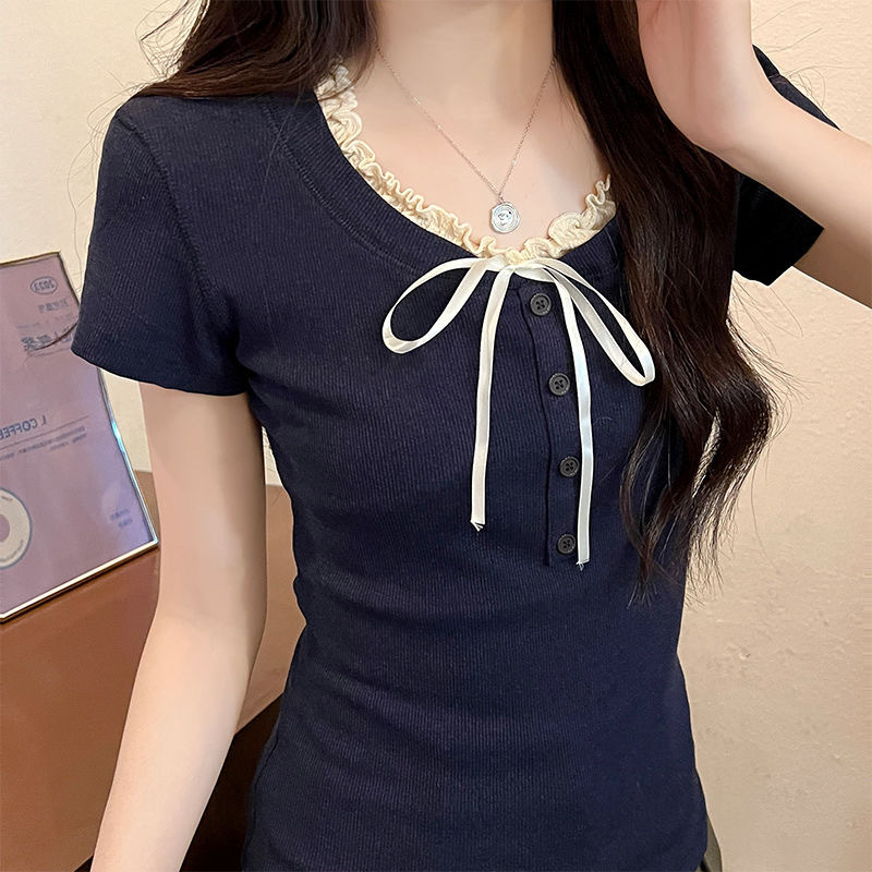 假两件拼接罗纹系带纯欲风短袖T恤女2025新款爆款夏季木耳边上衣