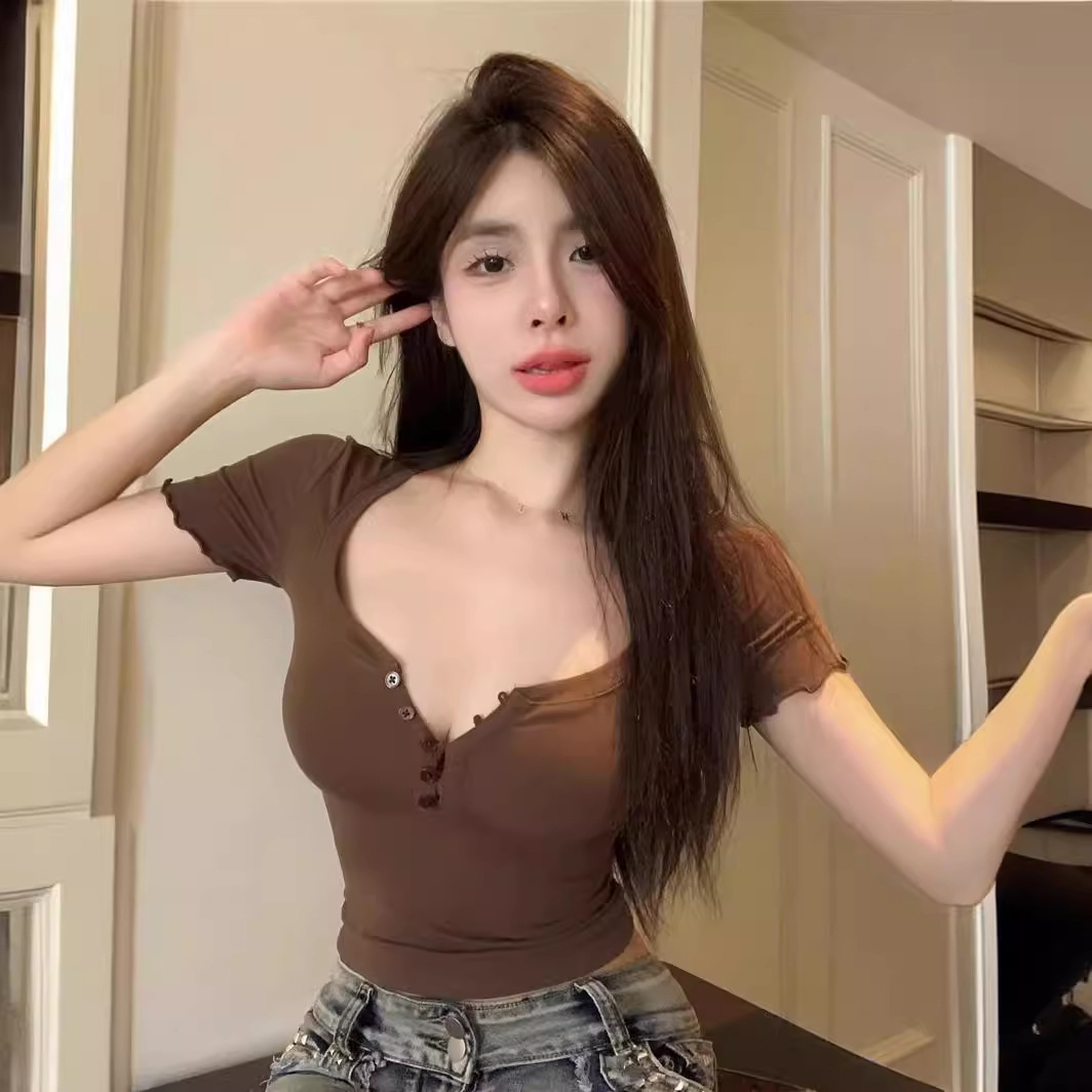 2025新辣妹纯欲紧身短袖t恤女夏季性感修身显瘦小众别致短款上衣