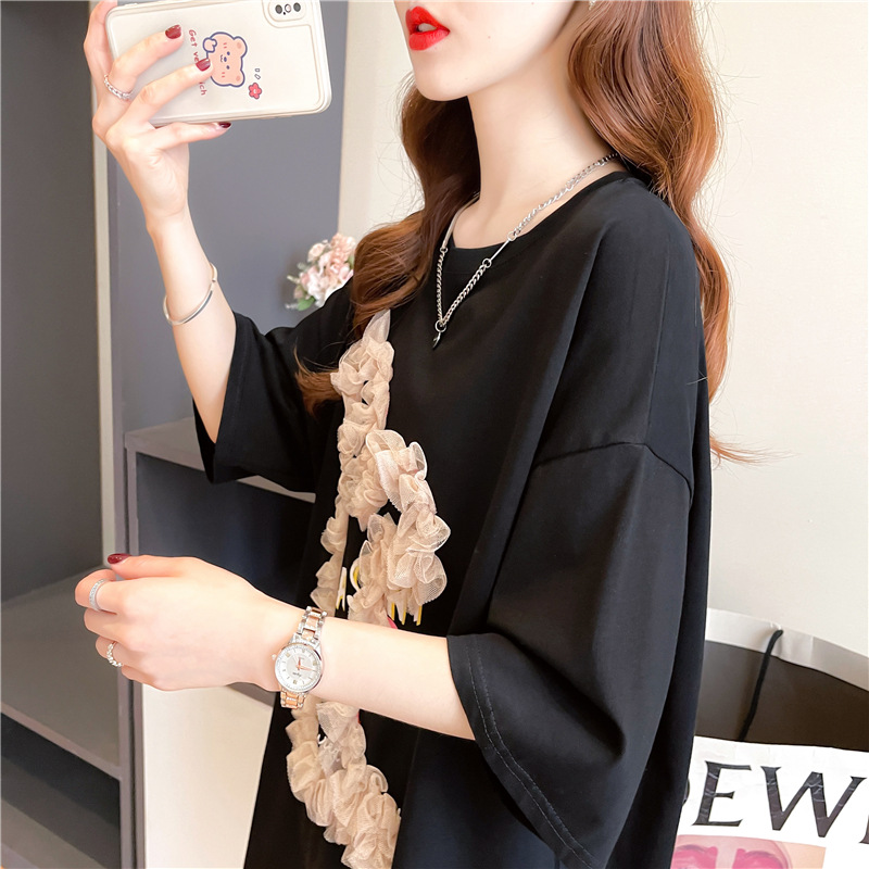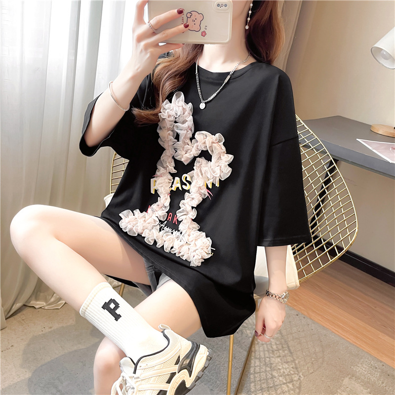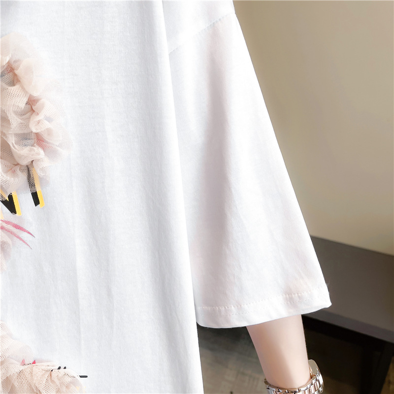 欧货重工立体蕾丝兔子短袖T恤女夏季百搭宽松中长款半袖上衣