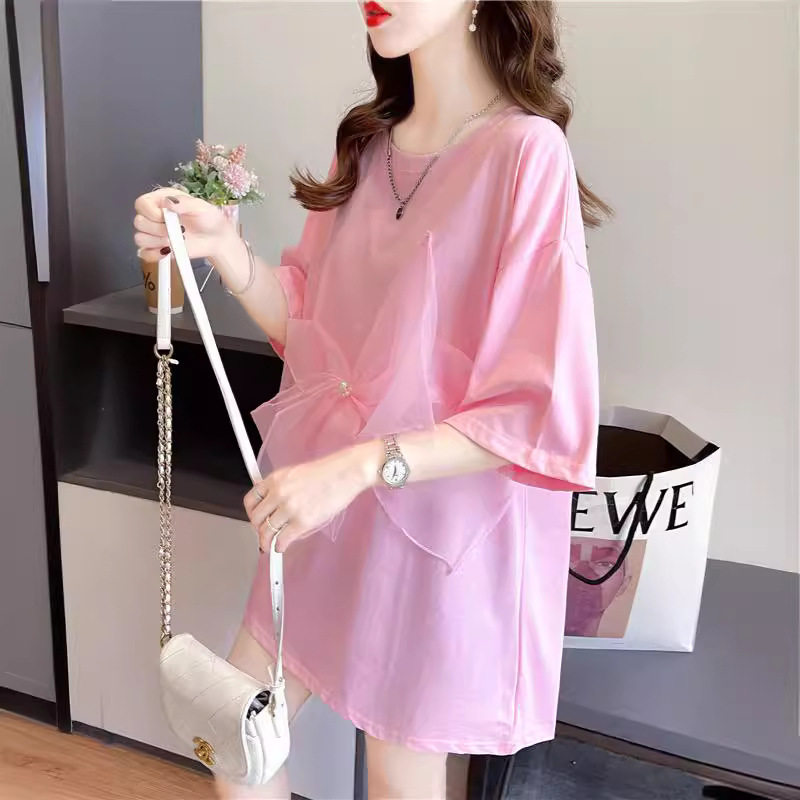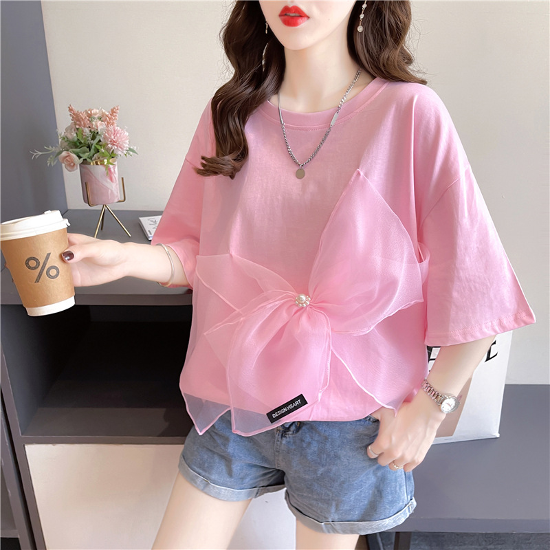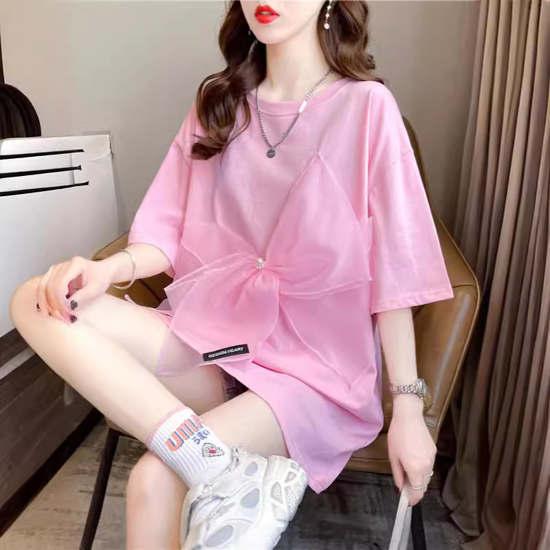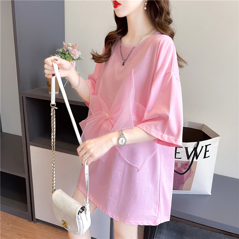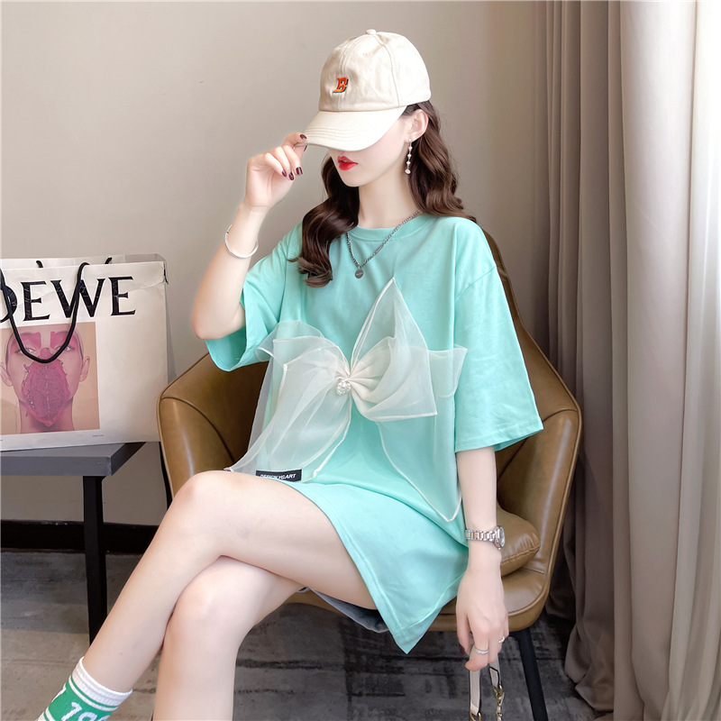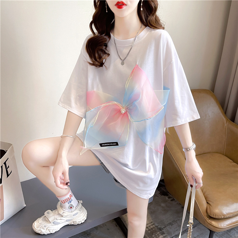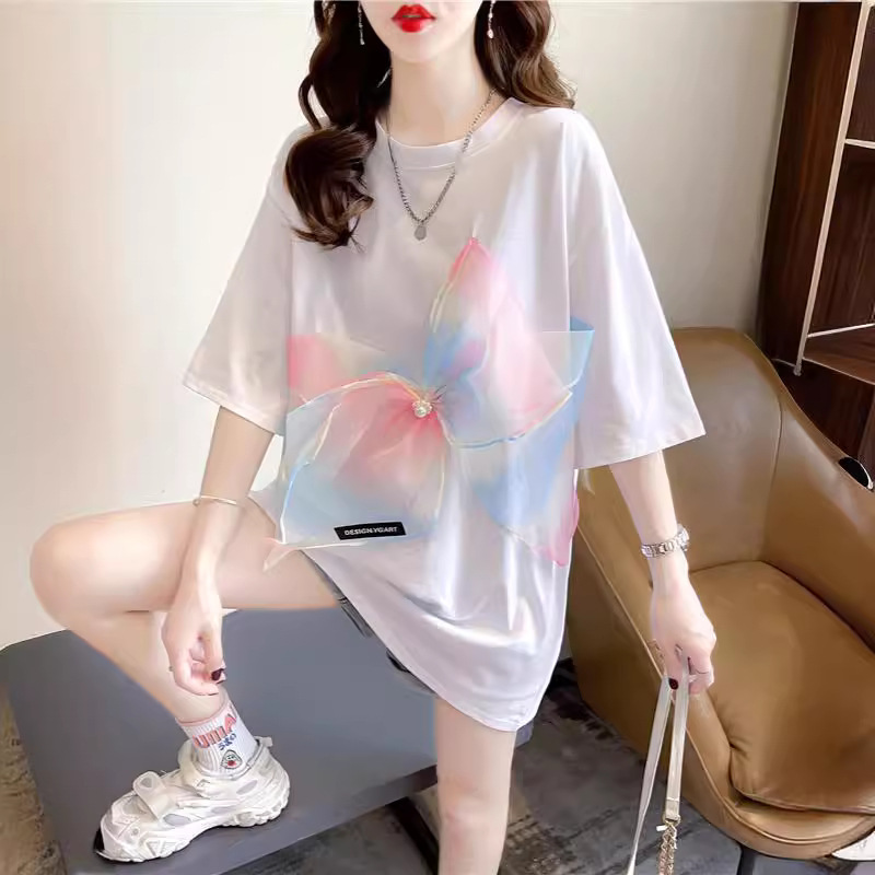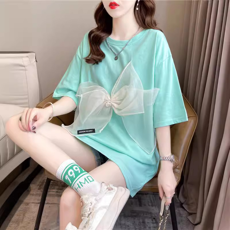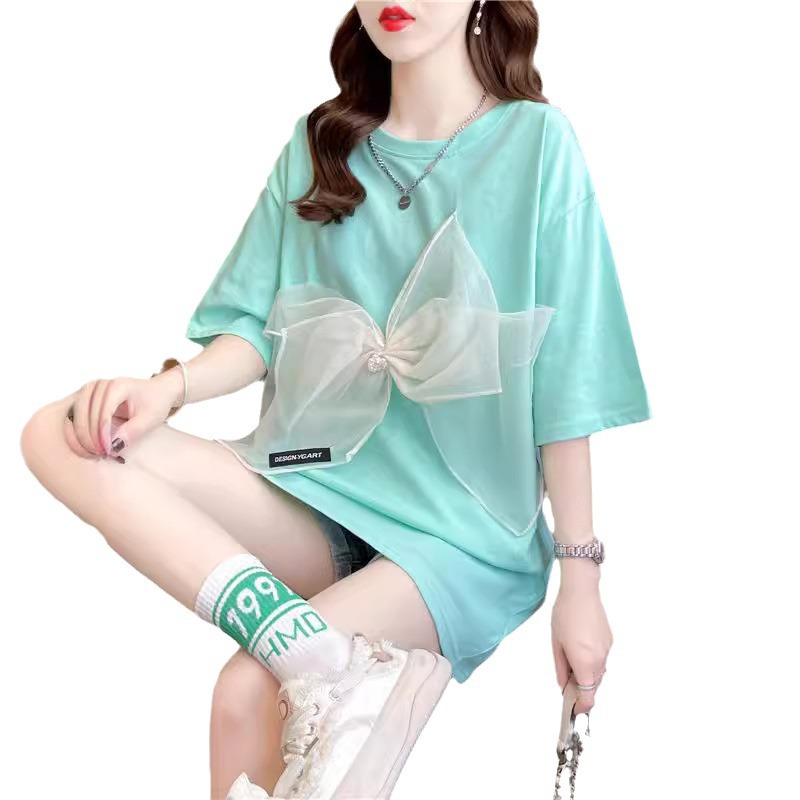 欧货T恤女短袖2025年新款夏装学生宽松大码中长款蝴蝶结上衣服潮
