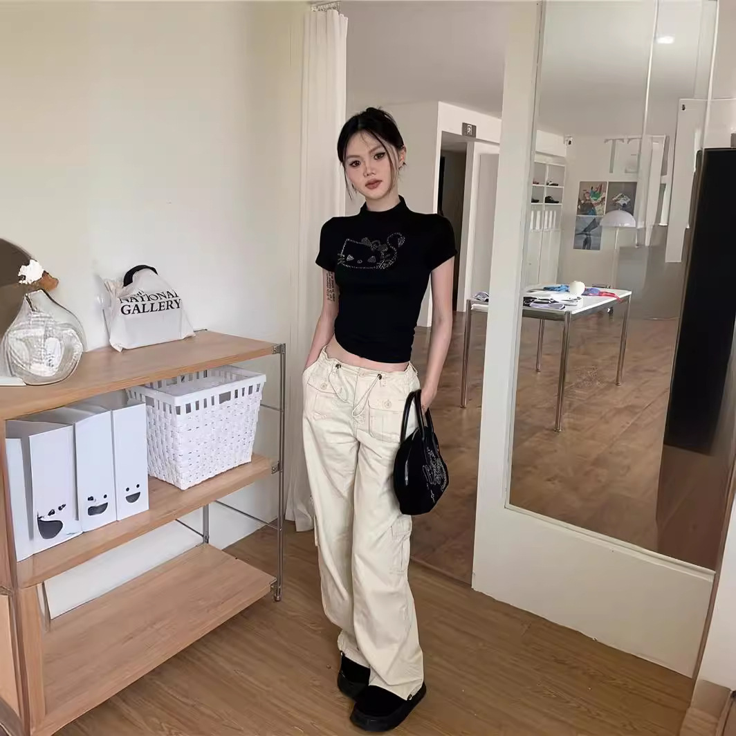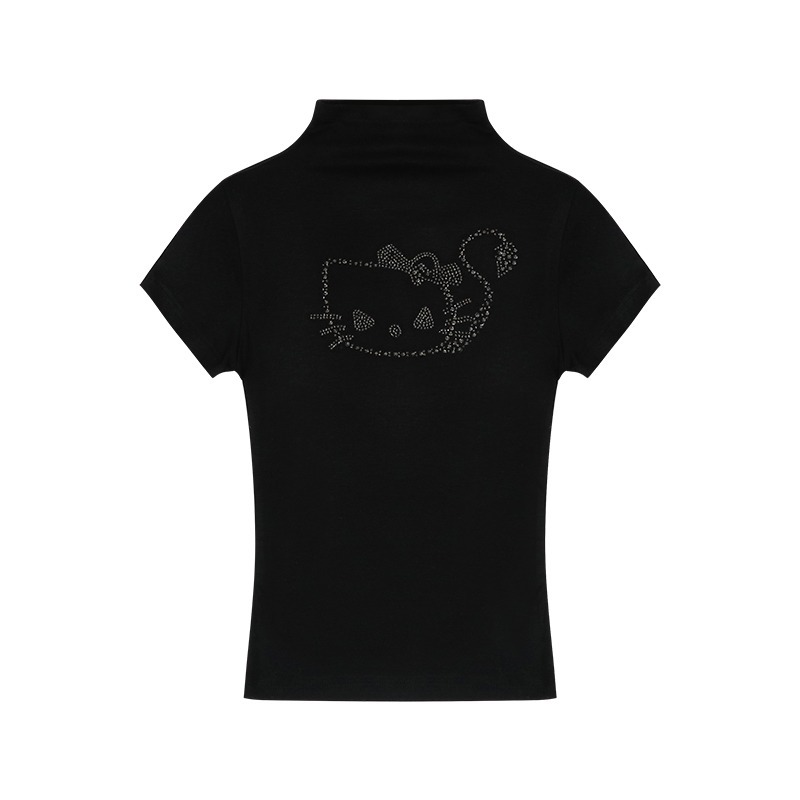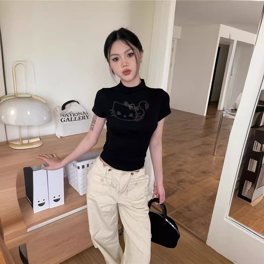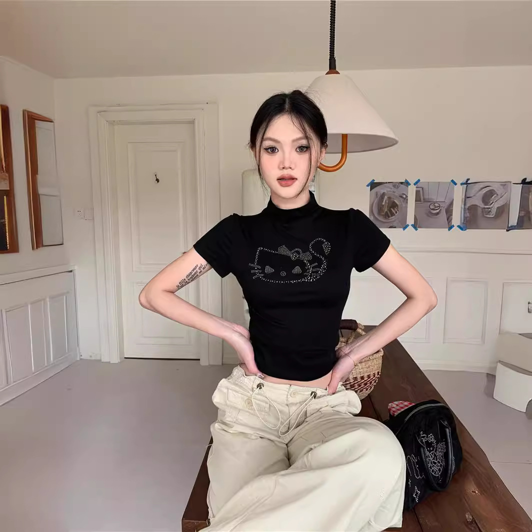 辣妹黑色烫钻半高领短袖T恤女新款夏季露脐紧身短款上衣ins潮欧货