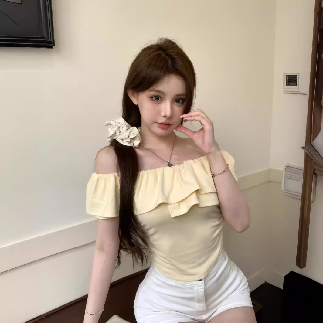 一字肩性感纯欲短袖T恤女夏季修身褶皱荷叶边蓝色短款别致小上衣