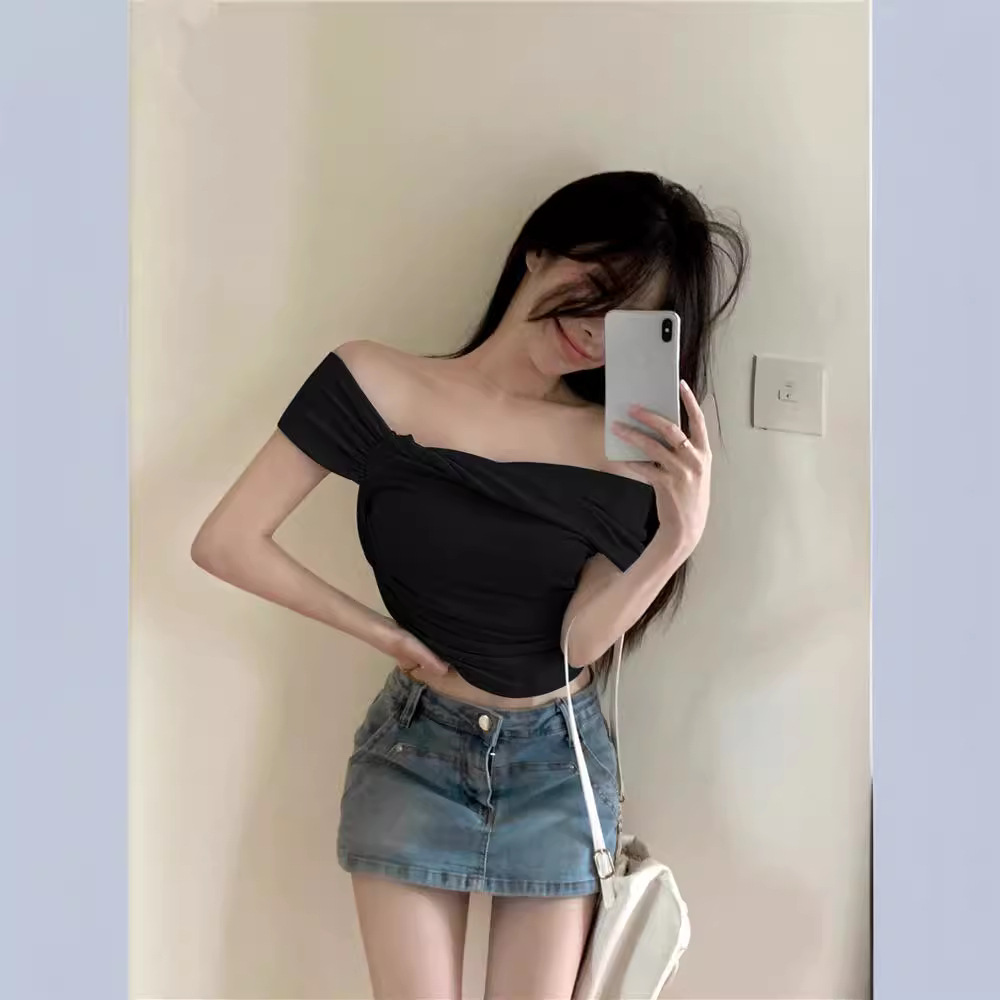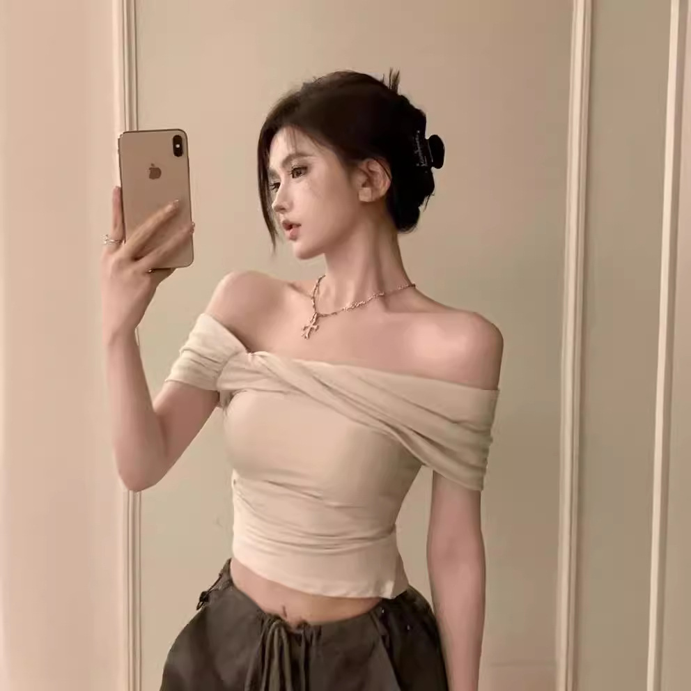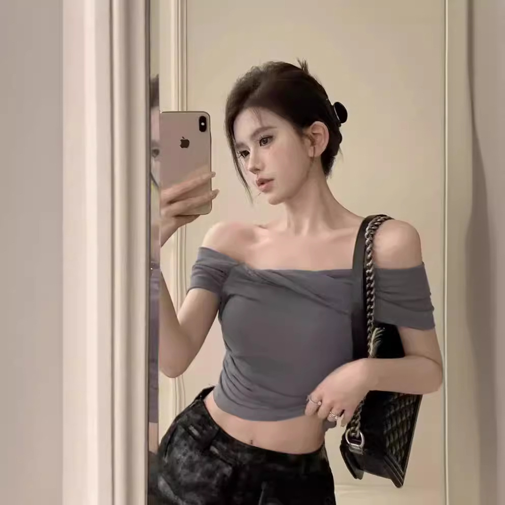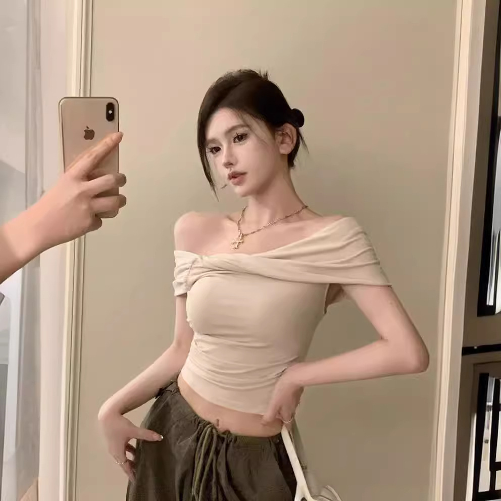 扭结一字肩短袖T恤女夏季纯欲辣妹内搭漏肩紧身别致短款上衣