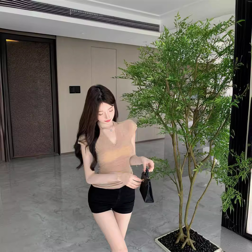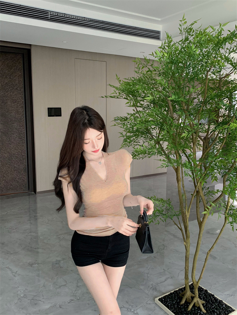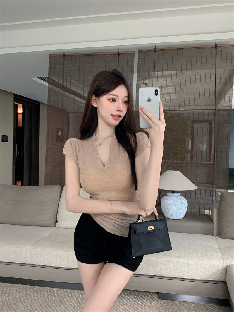 纯欲风深V领修身T恤女夏季辣妹性感紧身纯色内搭收腰打底衫上衣