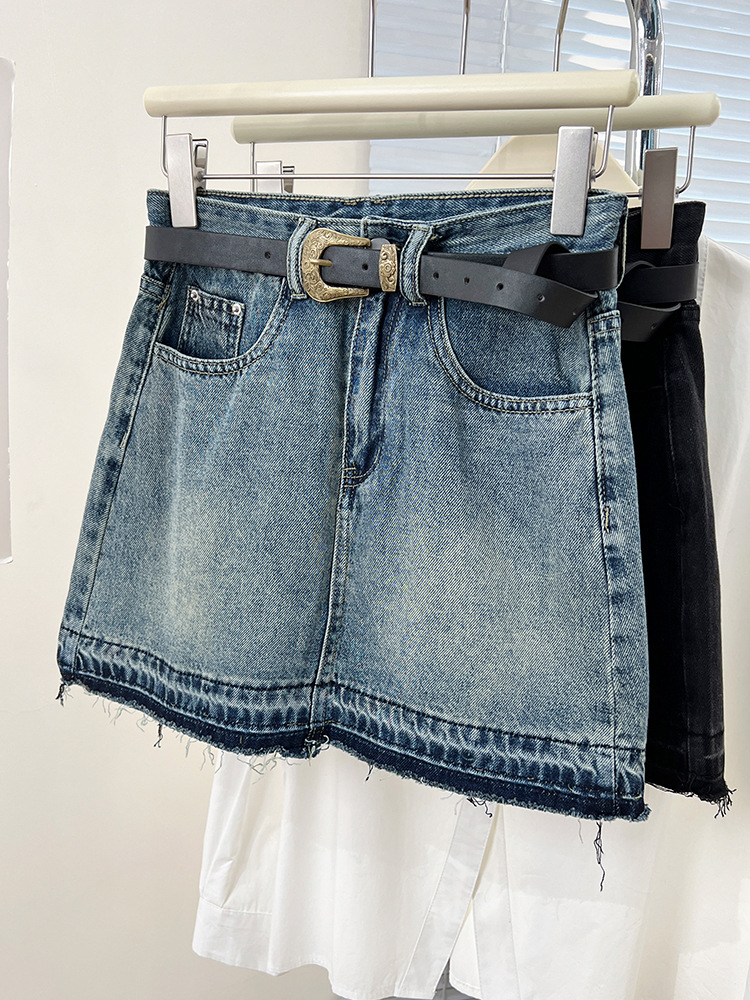 蓝色撞色毛边高腰牛仔半身裙女春夏新款设计感复古a字短裙子