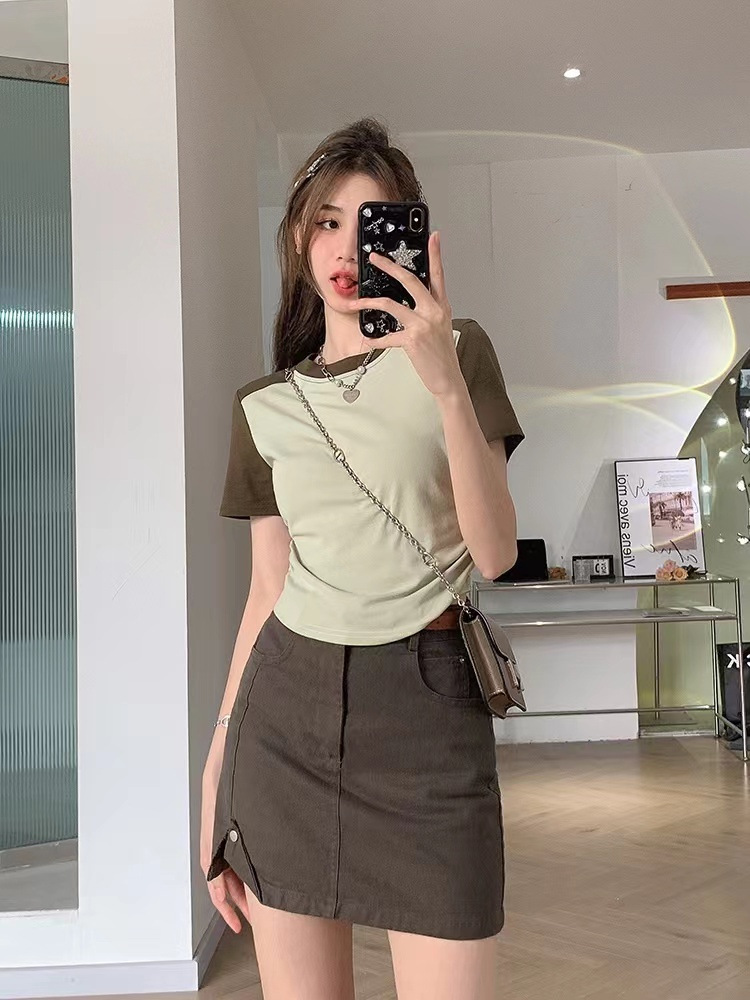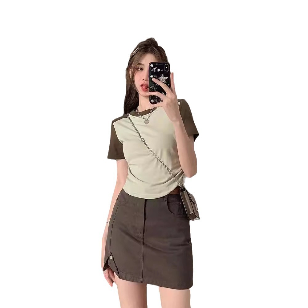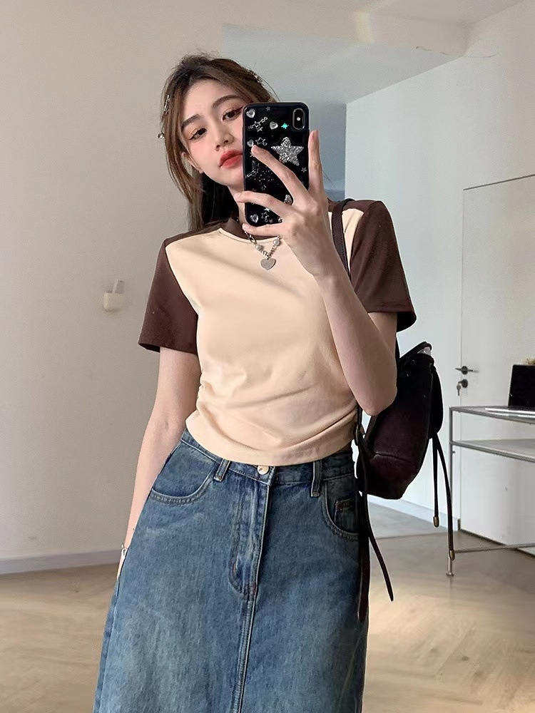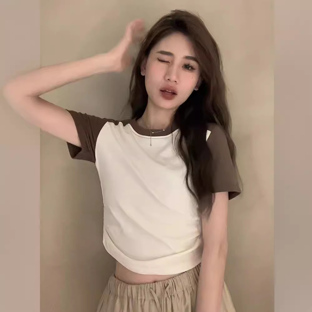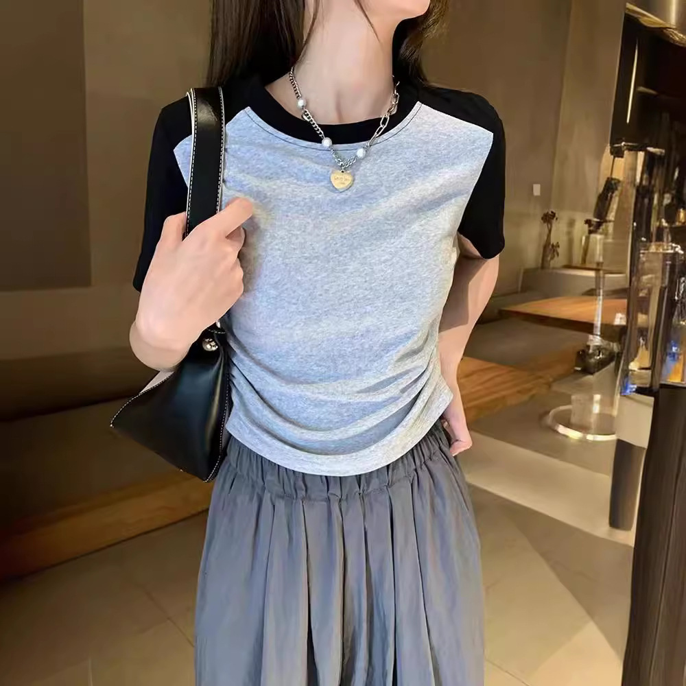 美式复古T恤女夏季2025新款正肩圆领打底衫修身撞色插肩短袖上衣