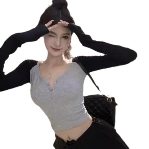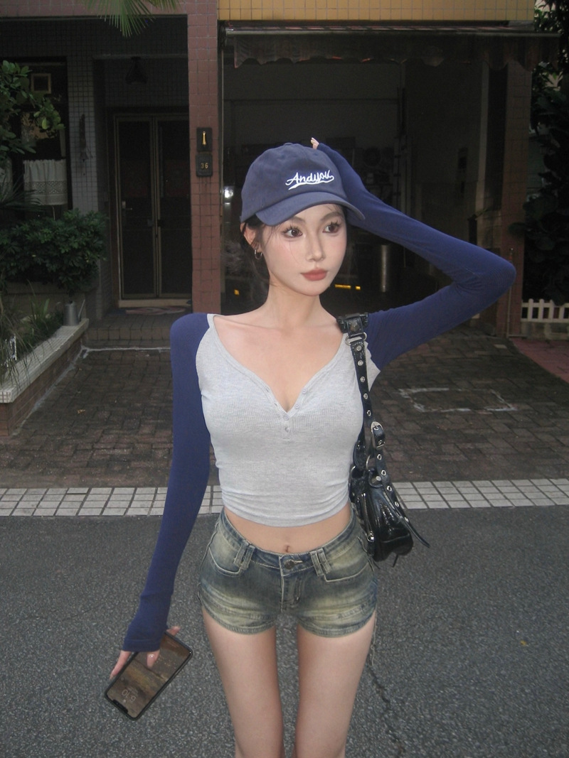 欧美辣妹风撞色V领排扣长袖T恤女春秋茶艺风修身跳舞紧身上衣