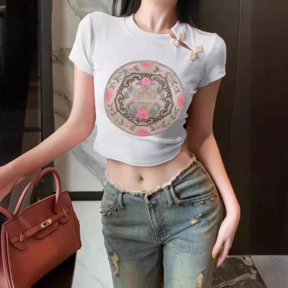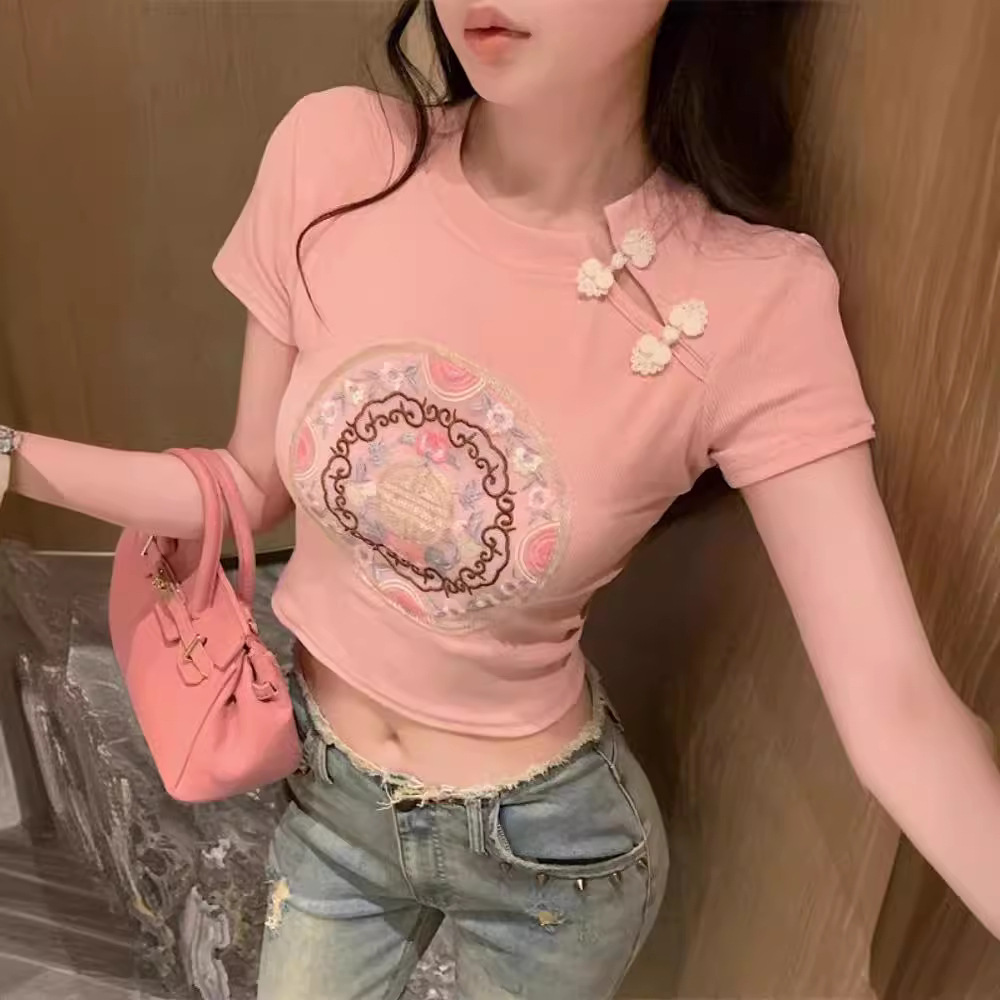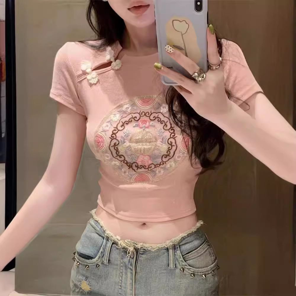 新中式国风盘扣重工刺绣短袖T恤女2025夏季新款修身显瘦短款上衣