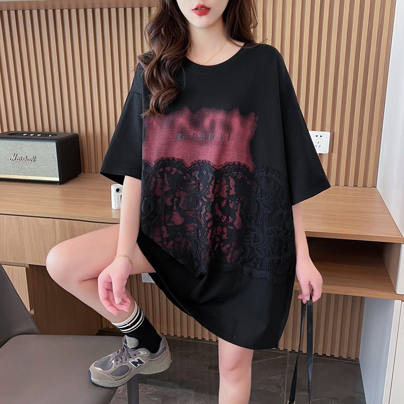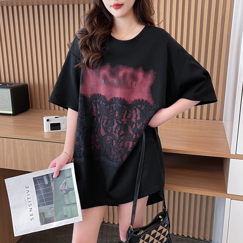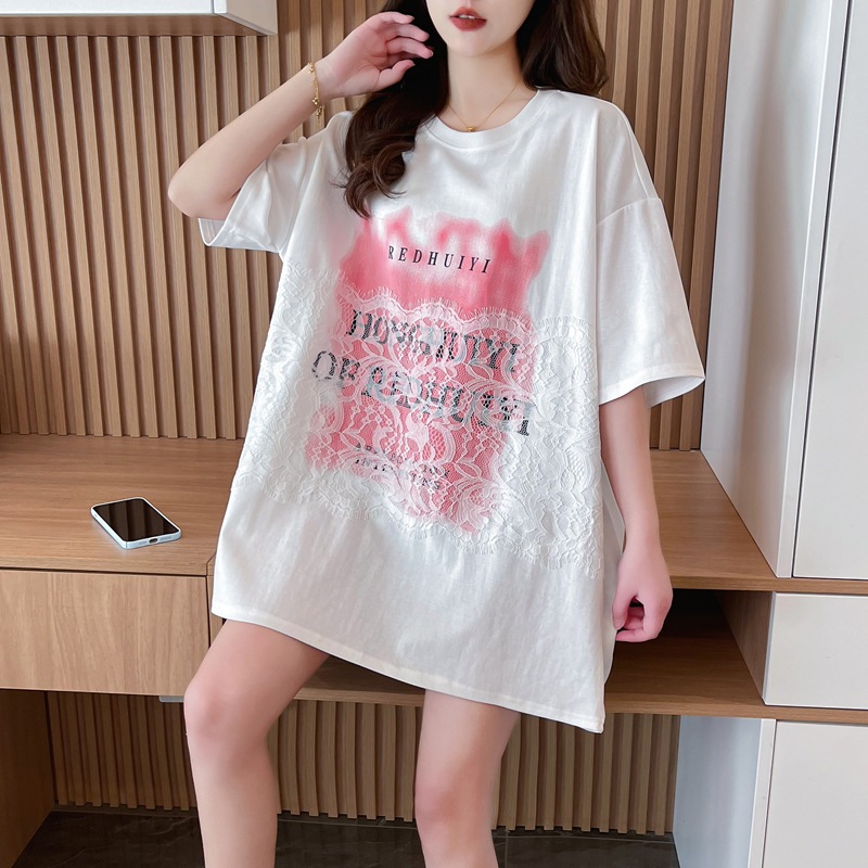 纯棉中长款胖mm夏季短袖T恤女宽松蕾丝拼接仙气遮肚子半袖上衣