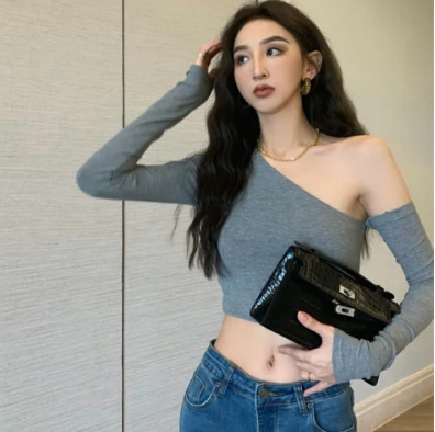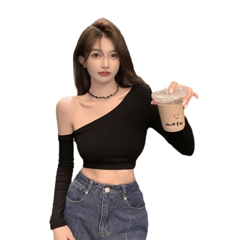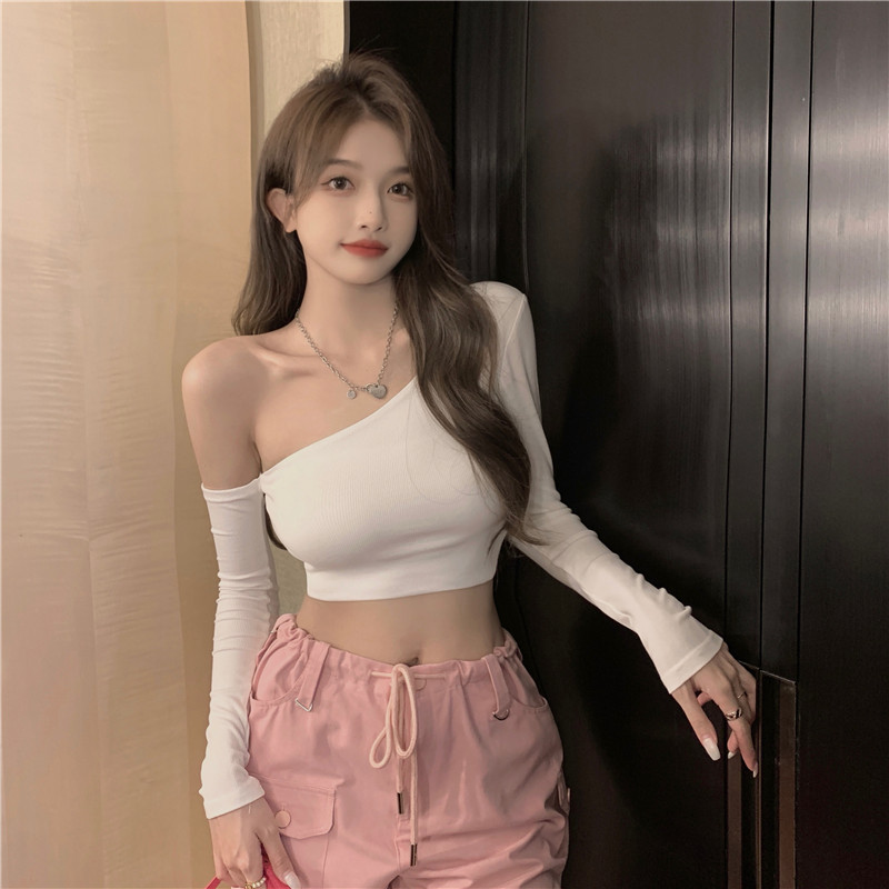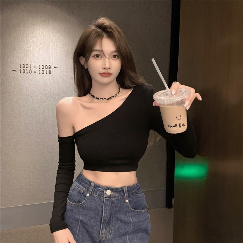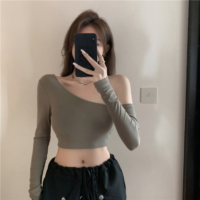 辣妹纯欲风性感斜领漏肩长袖T恤女春季短款紧身显瘦新款打底上衣