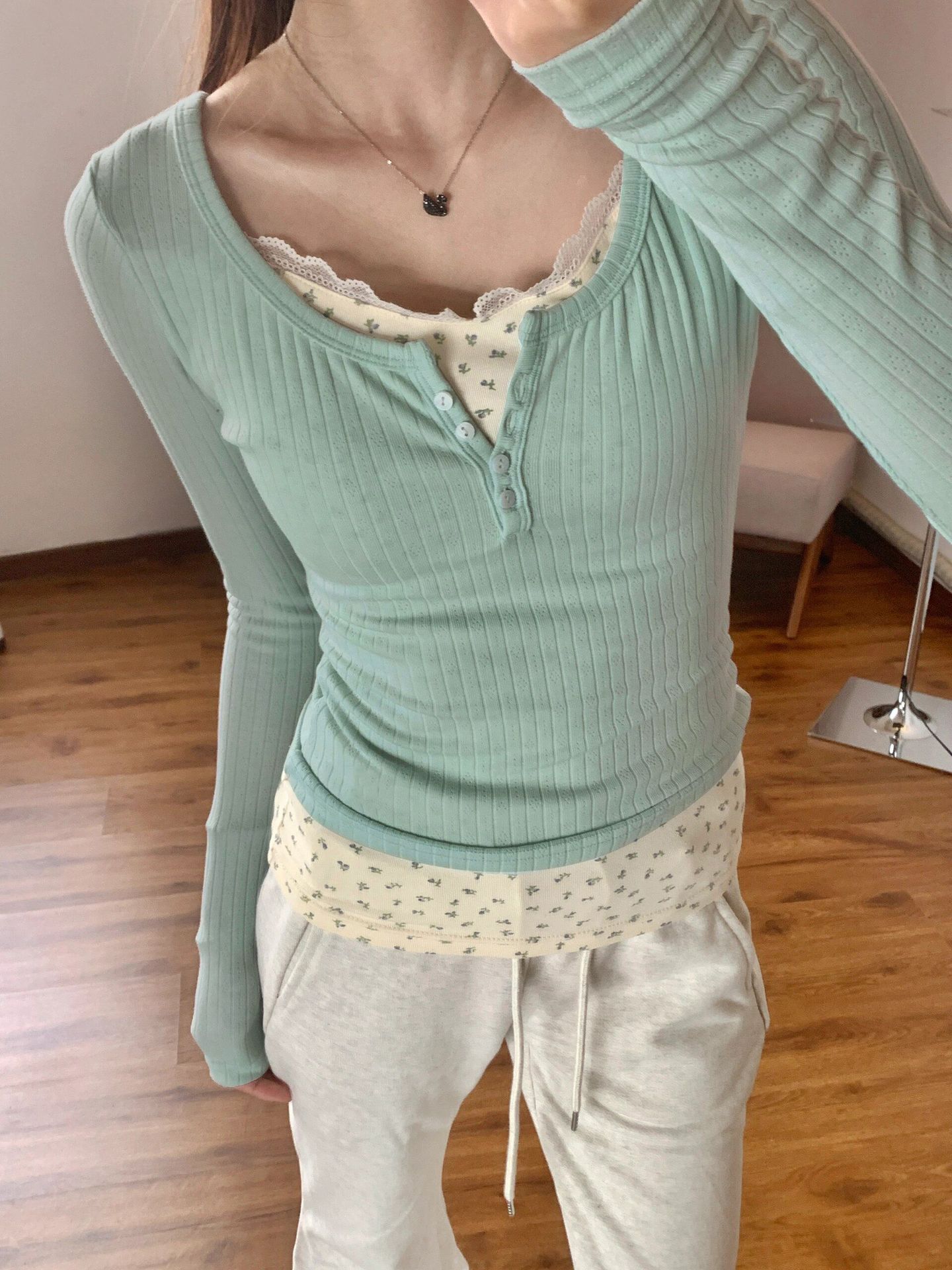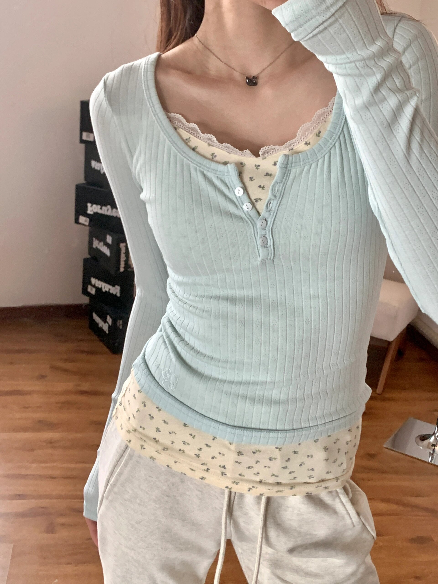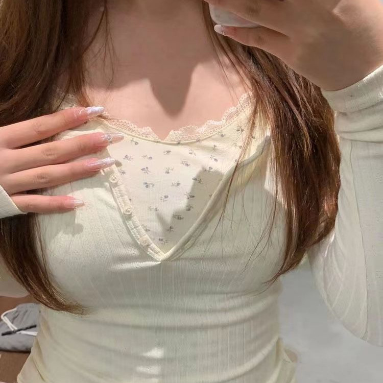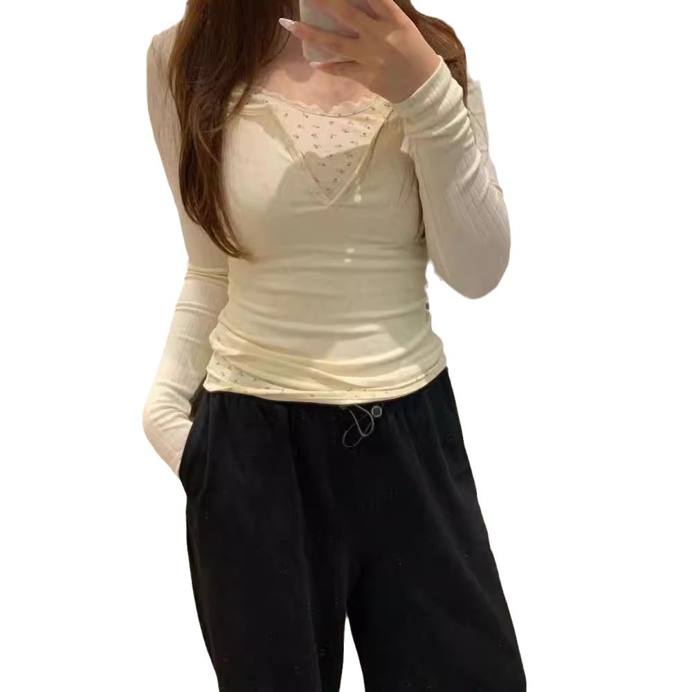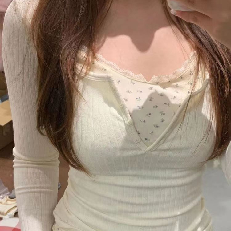 纯欲风蕾丝花边低领T恤女装早春假两件bm碎花 打底衫内搭短款上衣