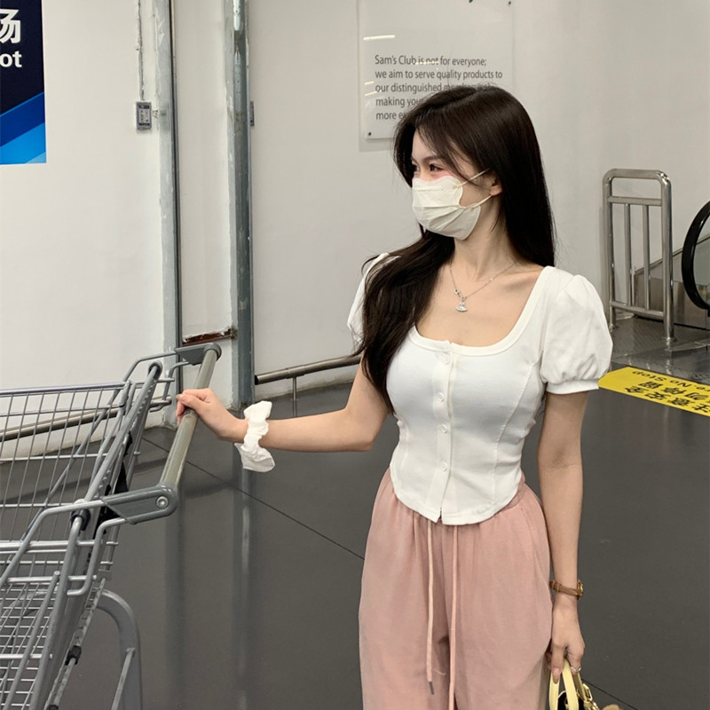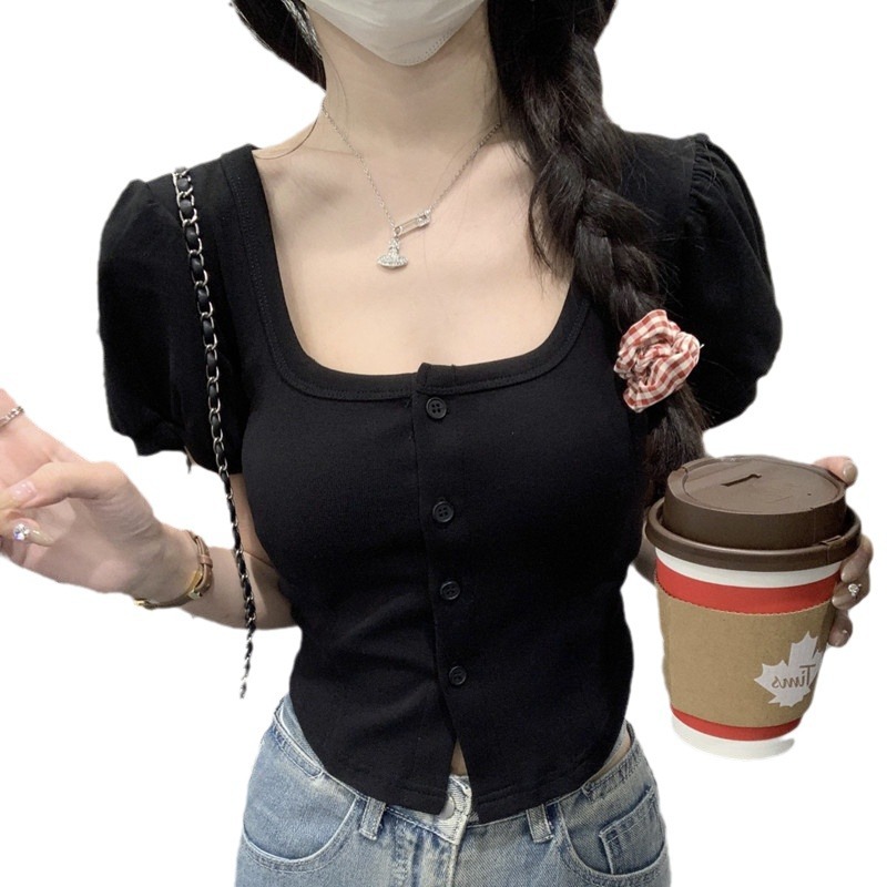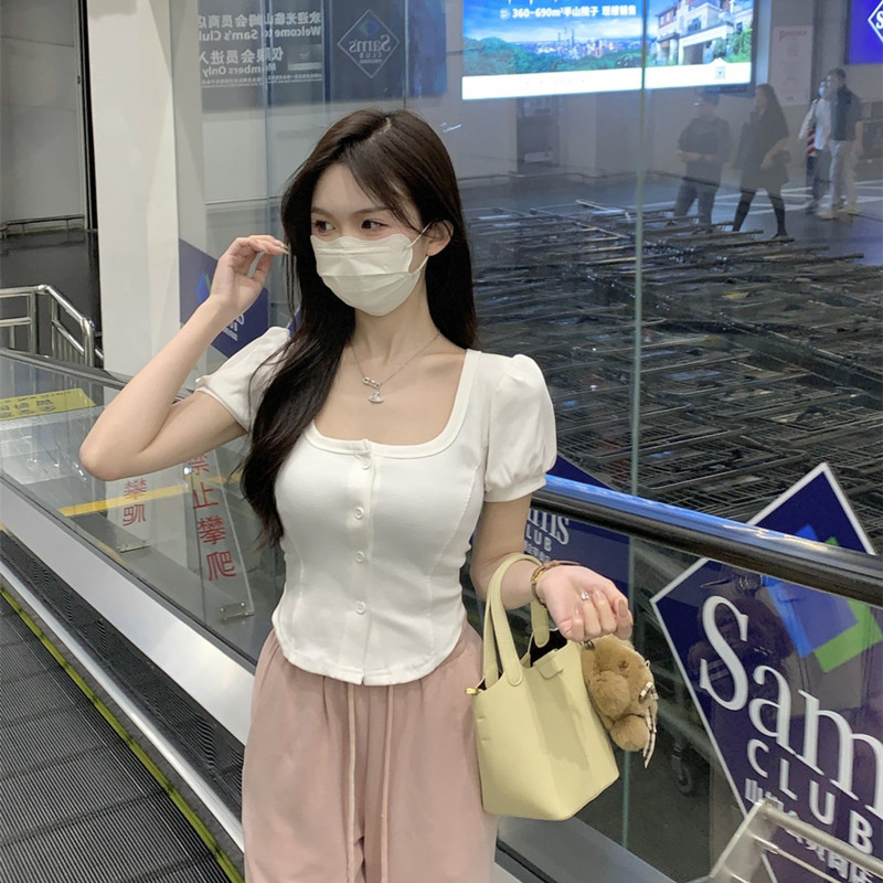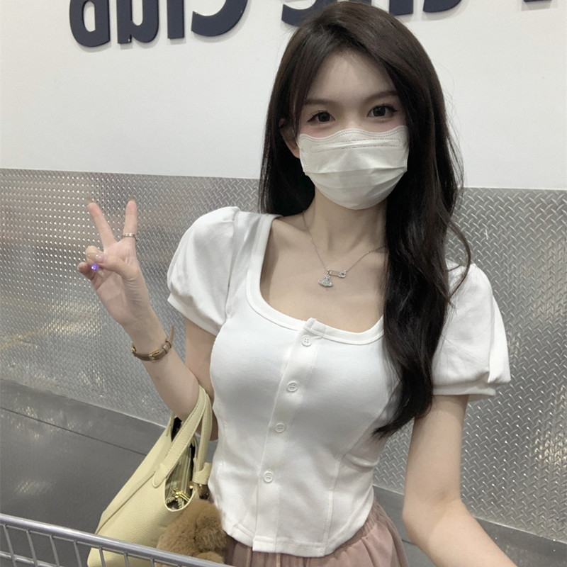 韩版方领泡泡短袖T恤女春季2025新款甜美百搭修身短款不规则上衣