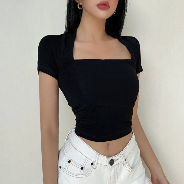 正肩短袖T恤女设计感小众夏季辣妹chic别致黑色修身方领短款上衣
