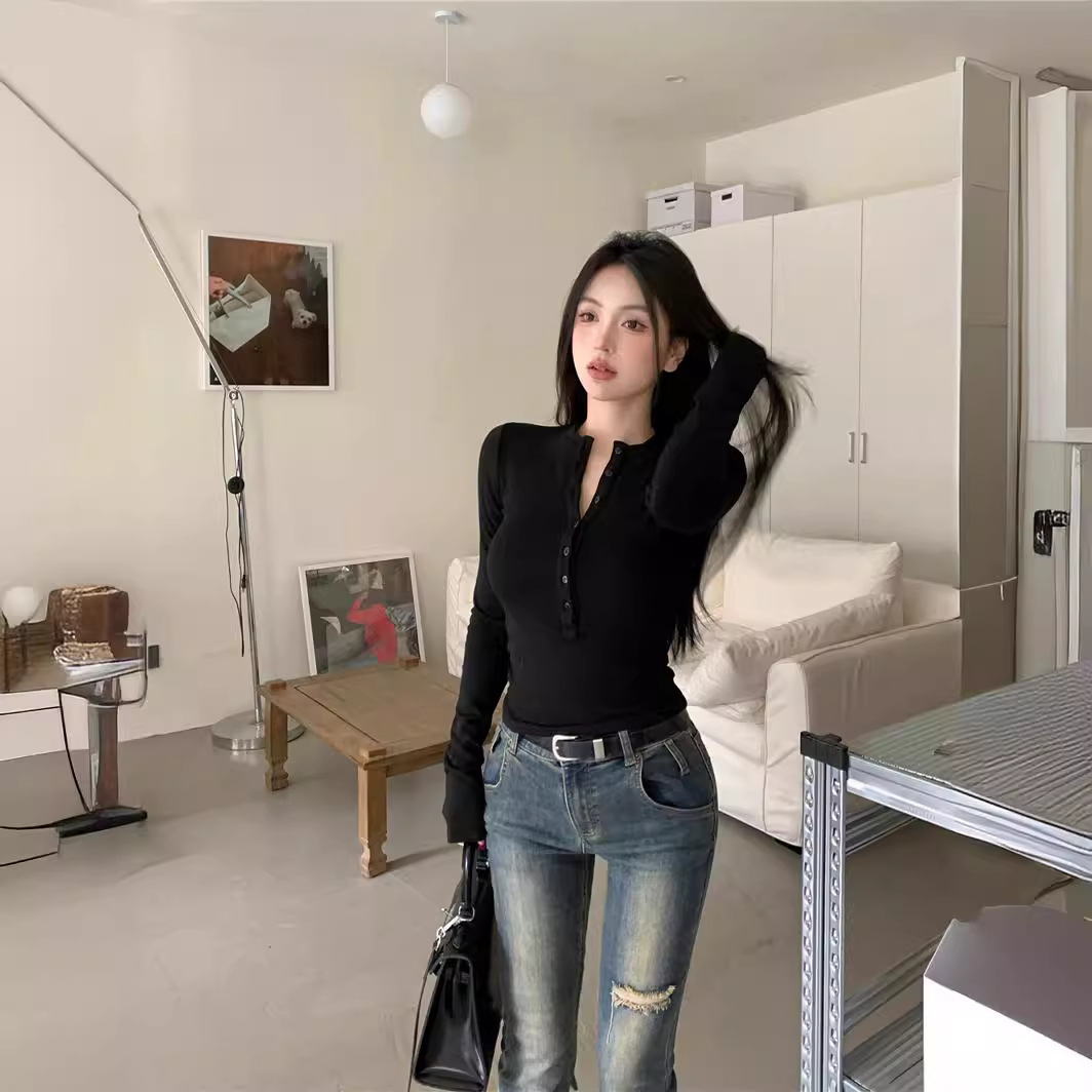 辣妹紧身弹力设计感套头打底衫性感长袖内搭上衣纯色高腰T恤女春