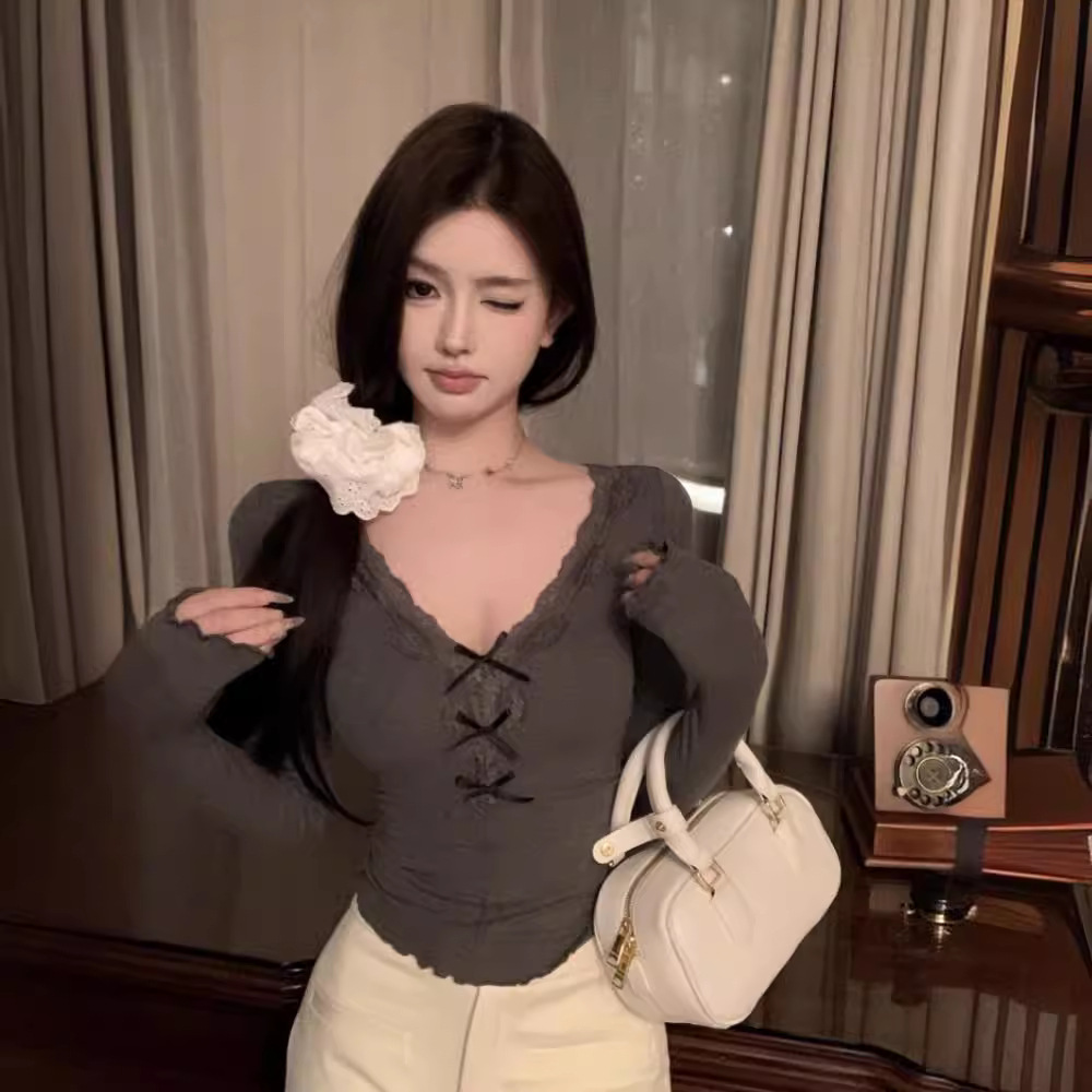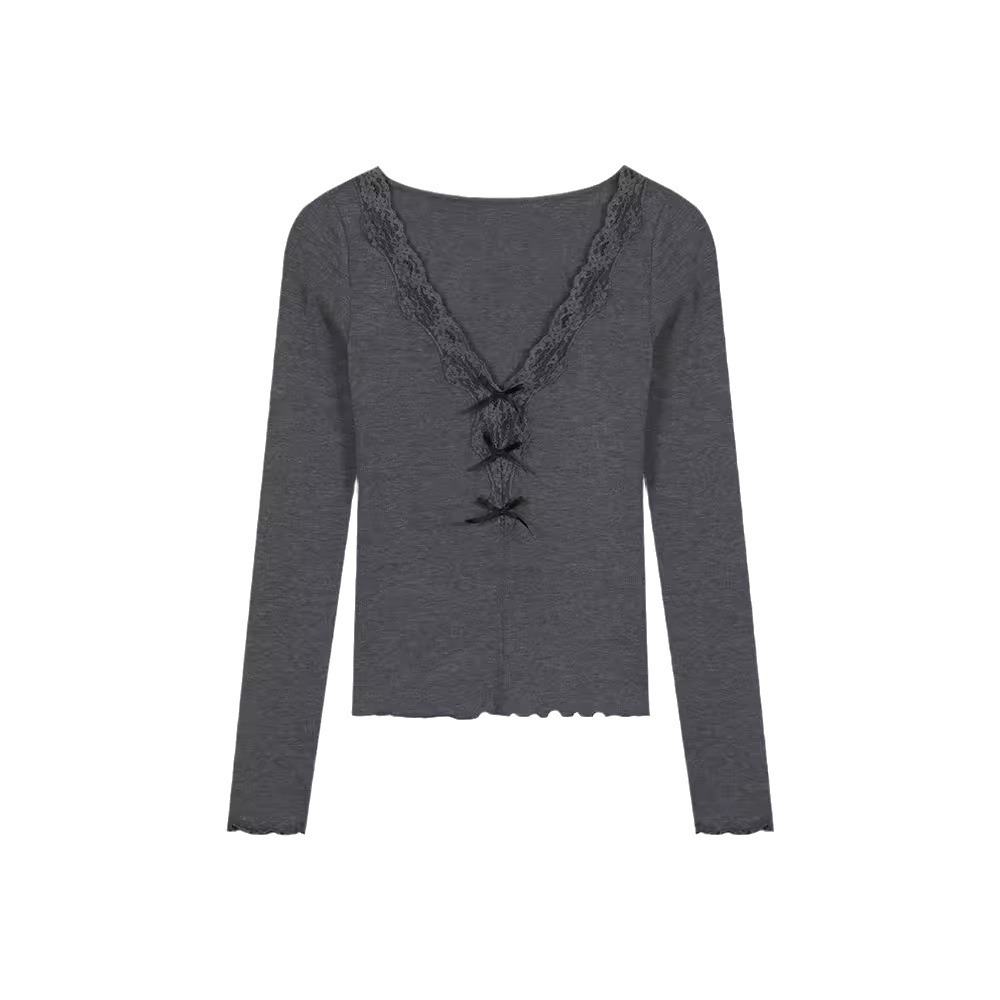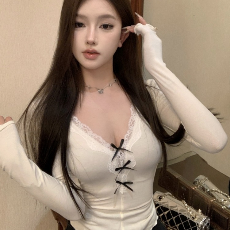 蝴蝶结蕾丝花边V领长袖T恤女春秋季修身短款白色内搭打底衫上衣