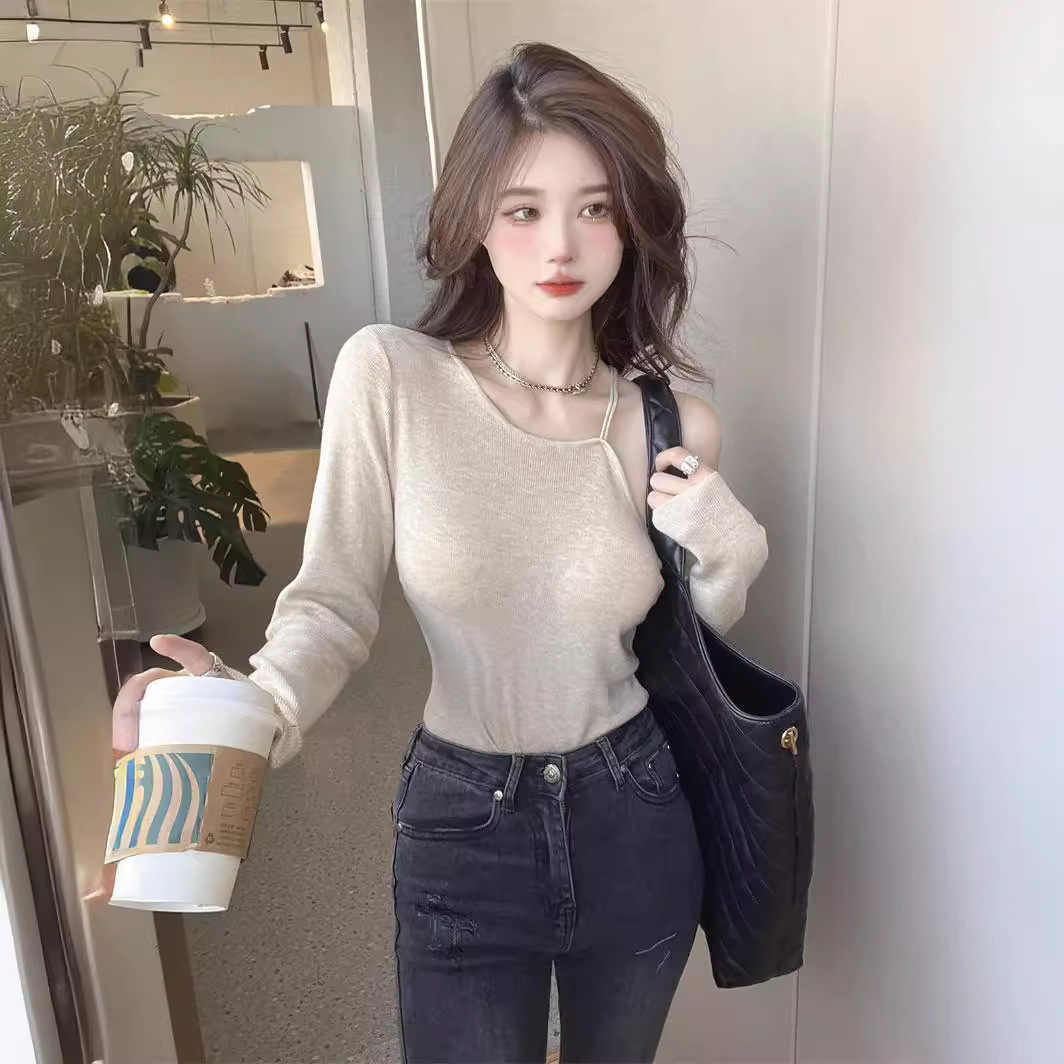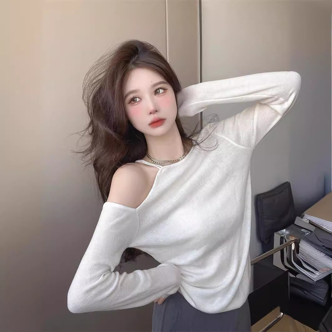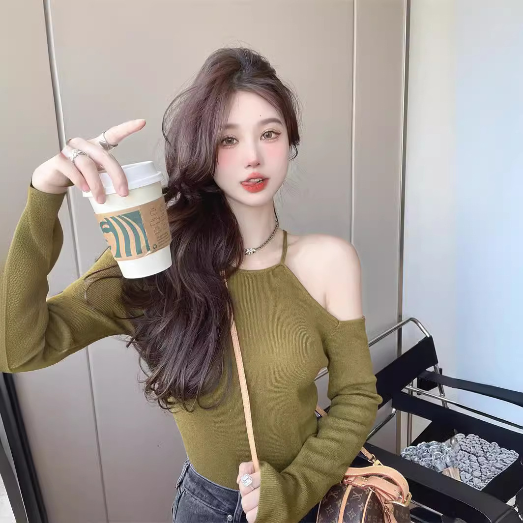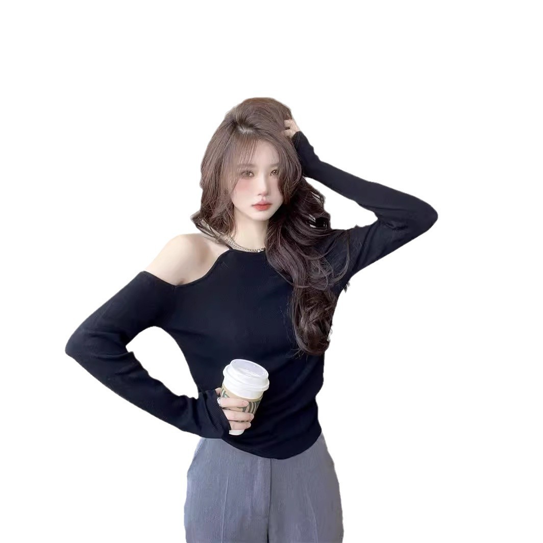纯欲辣妹性感一字肩挂脖上衣女早秋装别致独特漏肩长袖内搭打底衫