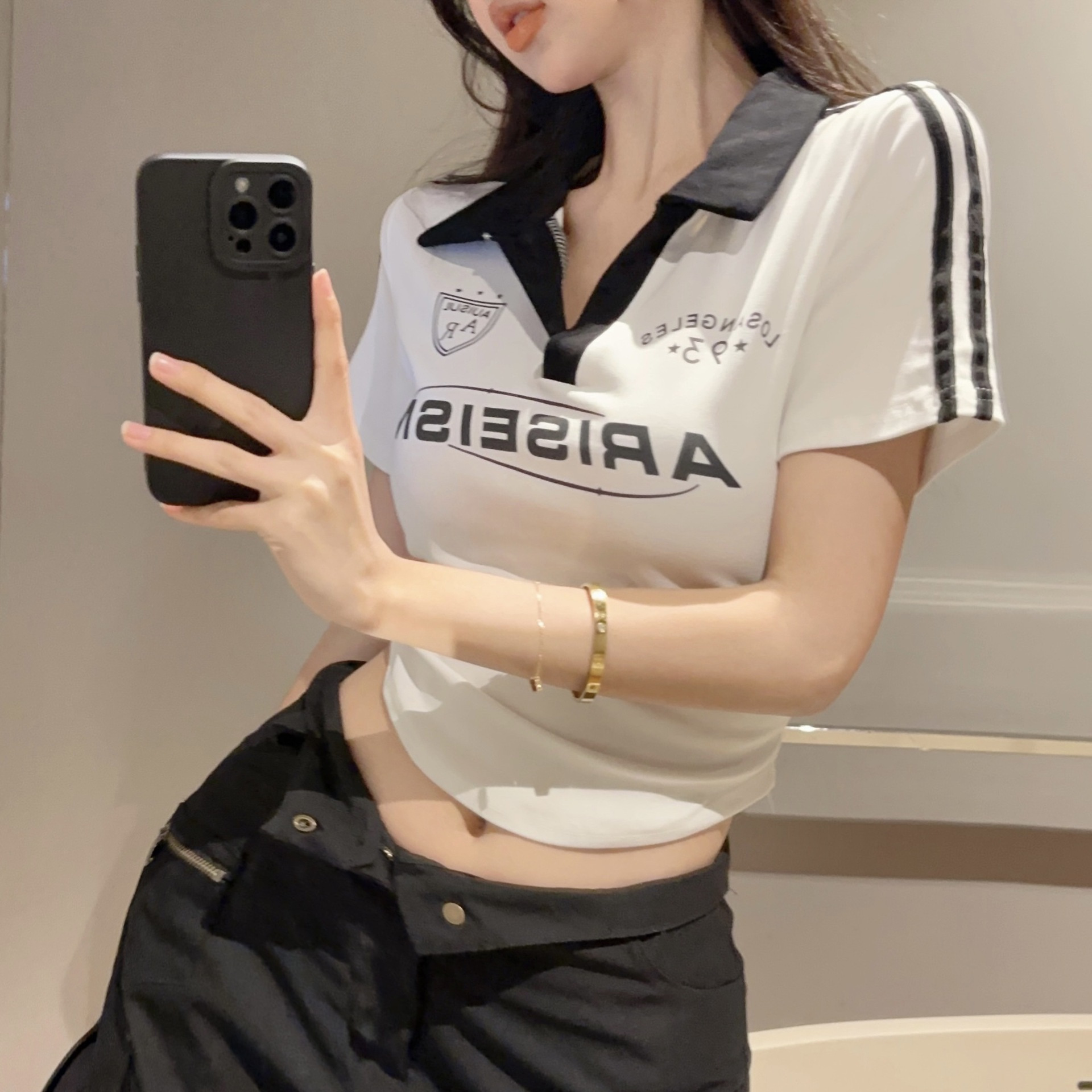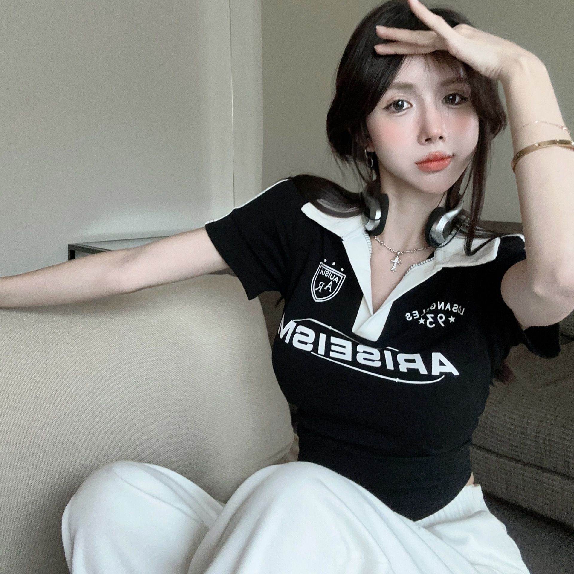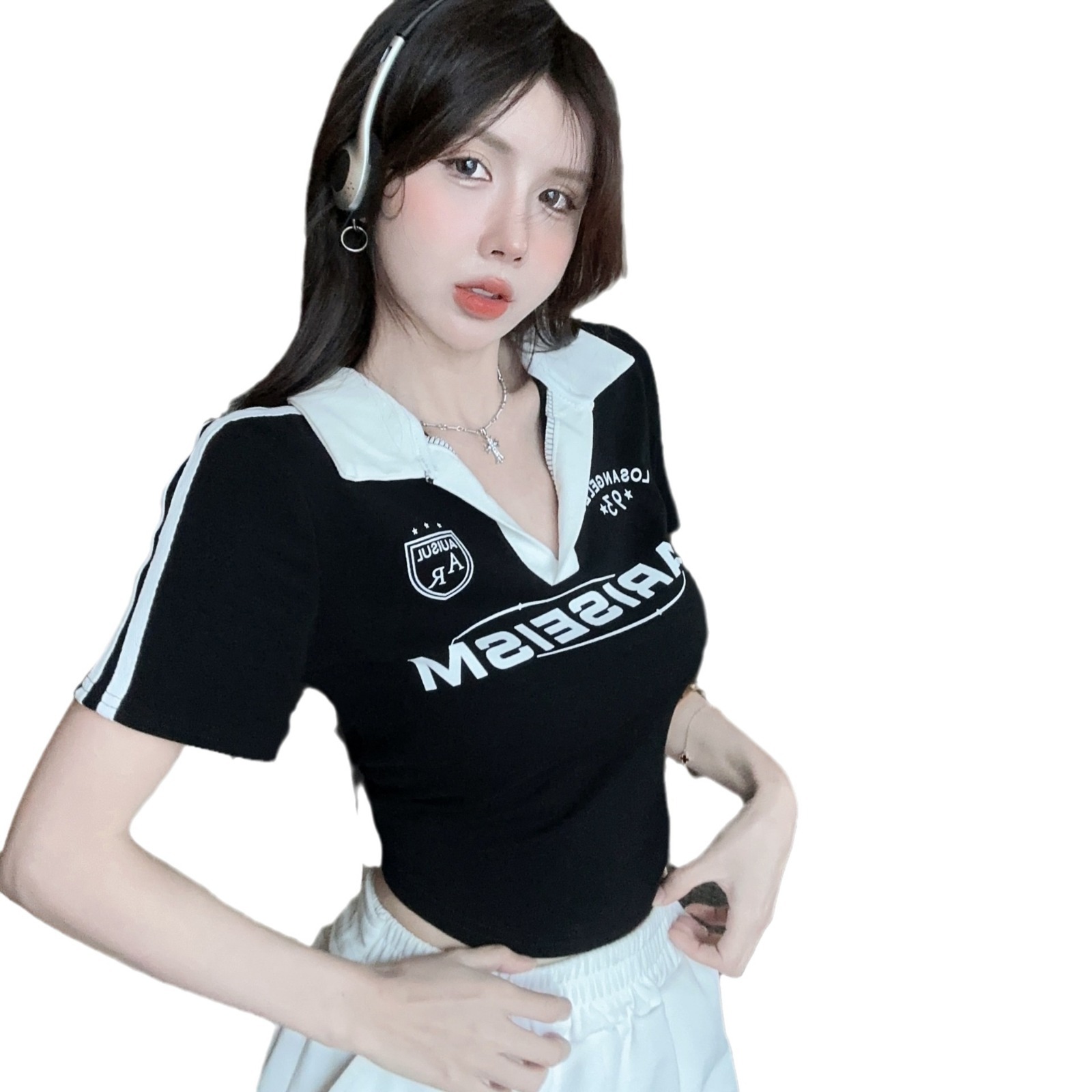 美式复古黑色polo领正肩短袖t恤女夏季2025新款短款修身V领上衣