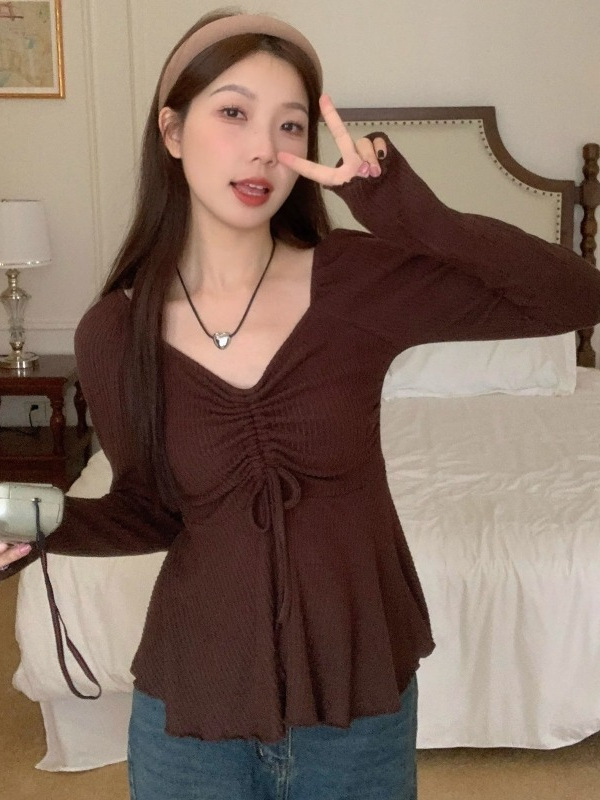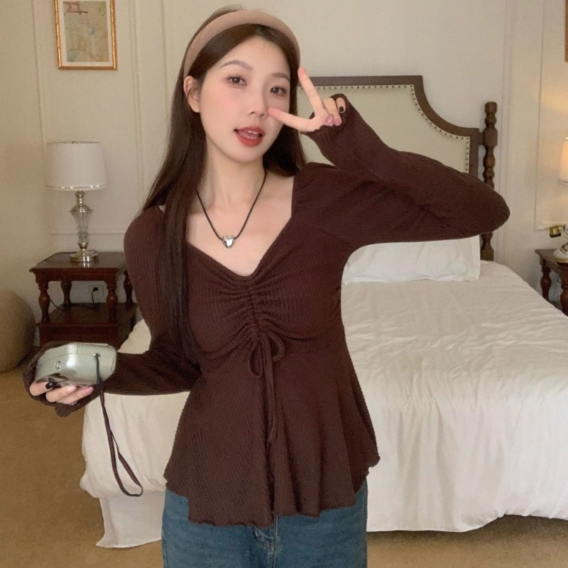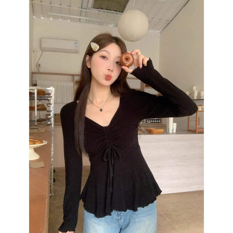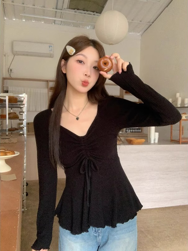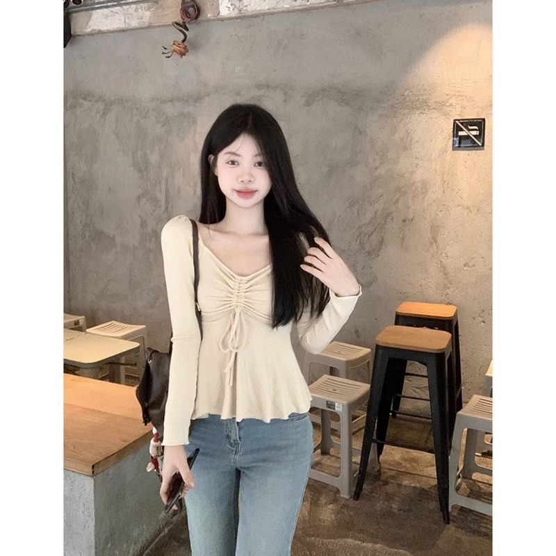 甜辣妹V领打底衫女2025新款春秋纯欲风显瘦别致设计感长袖T恤上衣
