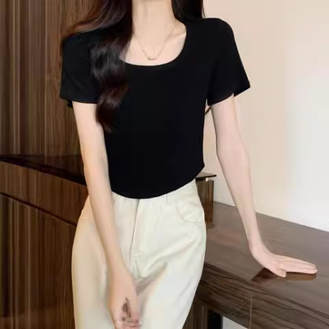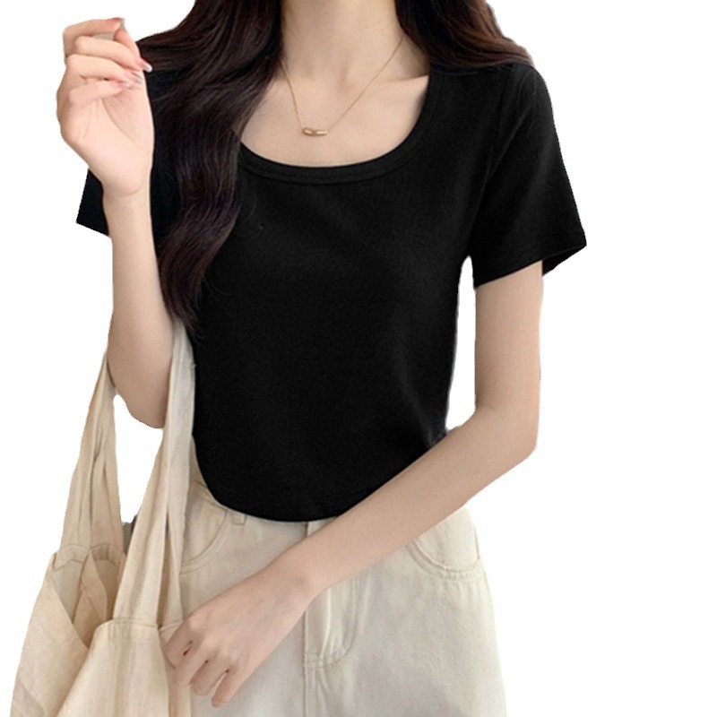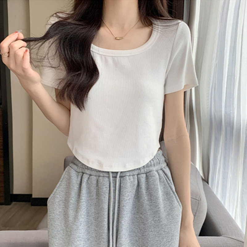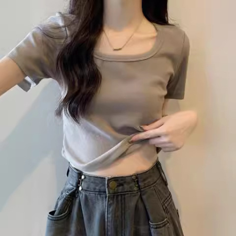 弧形下摆法式方领短款纯色修身T恤女夏辣妹正肩短袖打底纯欲上衣