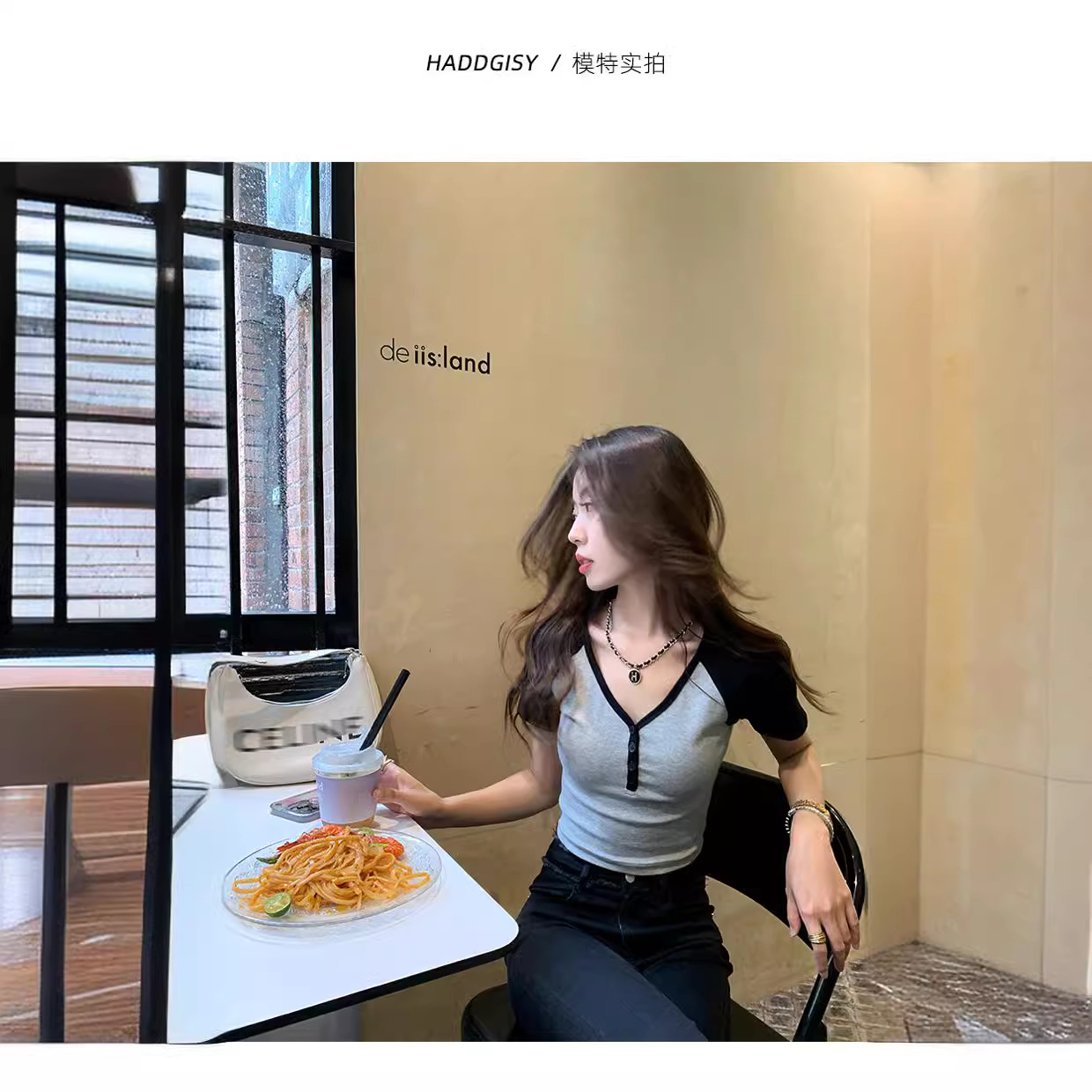 纯棉撞色短款短袖t恤女2025新款薄款纯欲风甜辣V领修身上衣欧货夏