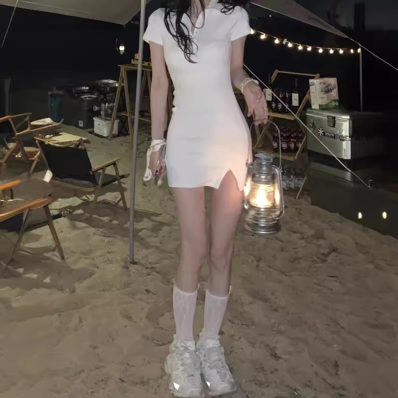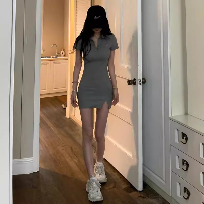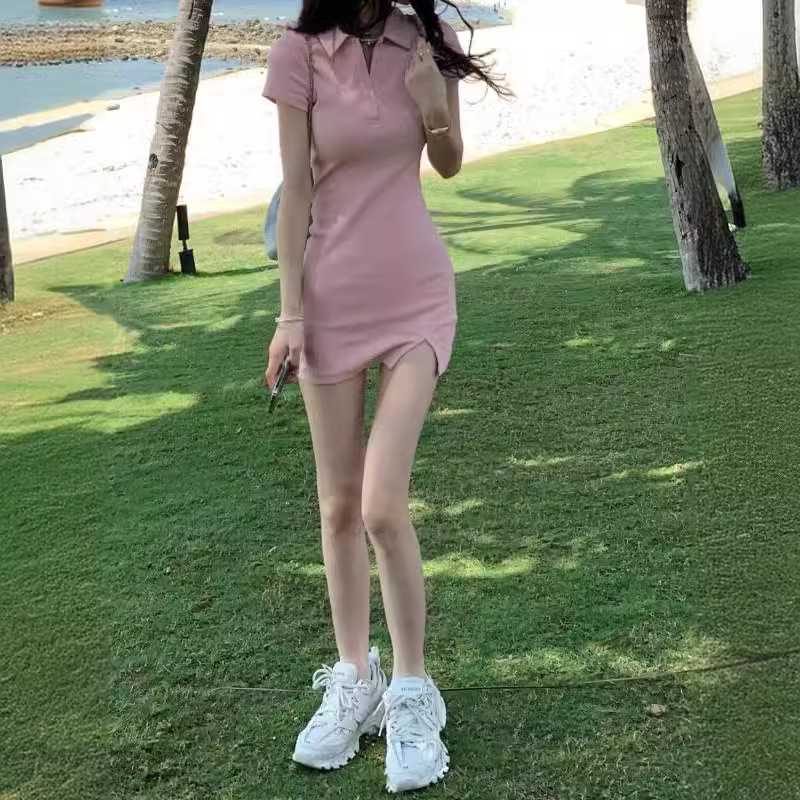 Polo领新款短袖微胖显瘦纯欲辣妹包臀裙韩版修身性感开叉连衣裙女