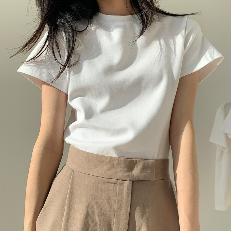 正肩短袖T恤女夏季休闲百搭上衣体桖修身显瘦基础美式款打底衫ins
